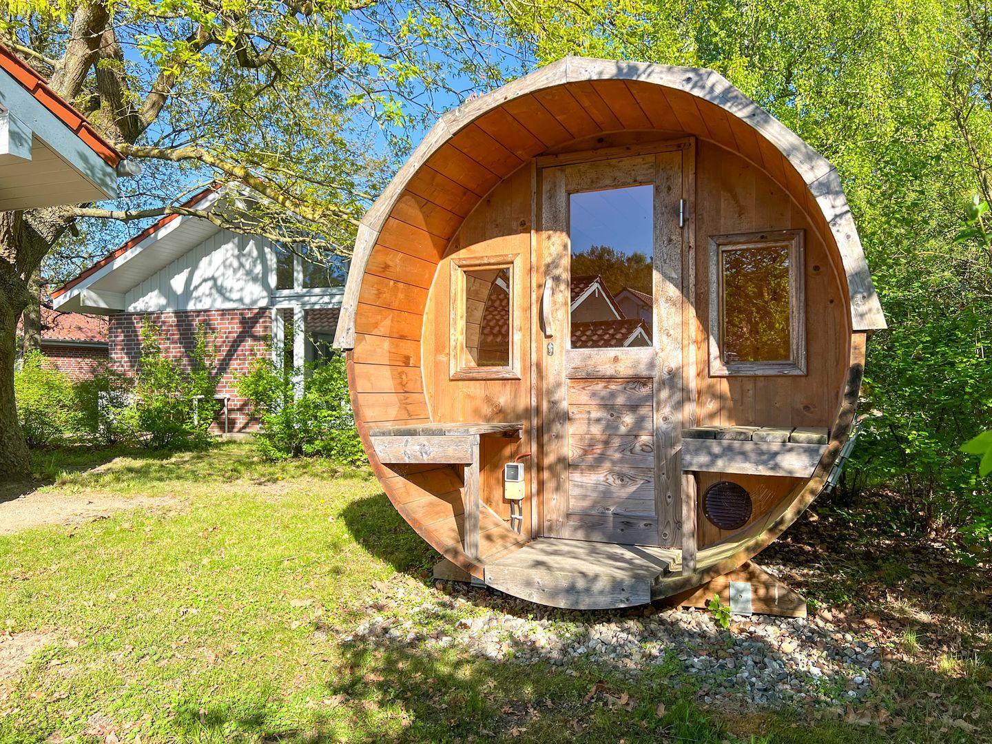 Am Ferienhaus befindet sich eine großzügige Terrasse. Außerdem gibt es eine eigene Fasssauna mit direktem Blick in den Garten für Ihr privates SPA Erlebnis. Der eigene kleine Garten rundet dabei Ihren persönlichen Rückzugsort ab.