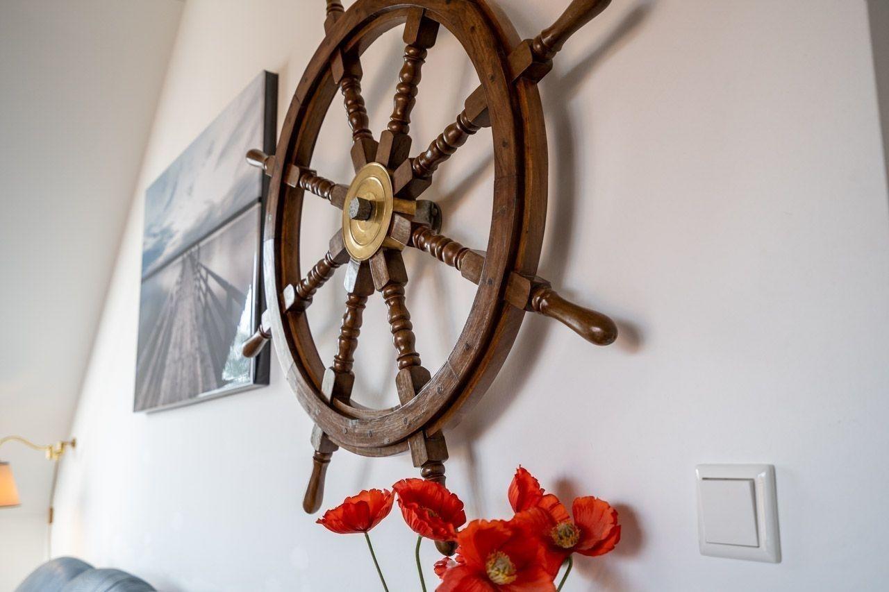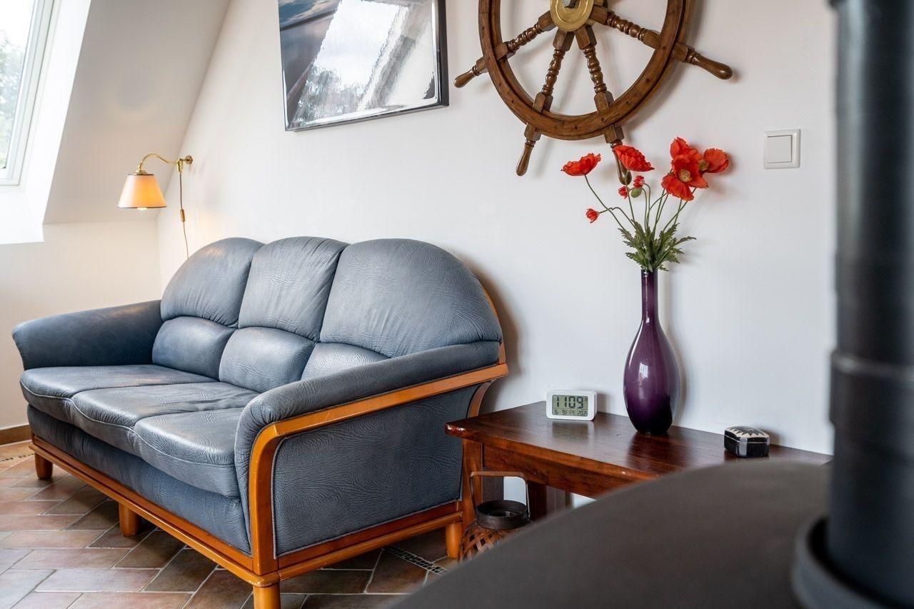 Die Ferienwohnung bietet ein modernes und komfortables Ambiente, ideal für einen erholsamen Aufenthalt. Sie verfügt über zwei Schlafzimmer, eines mit einem Doppelbett und das andere mit drei Einzelbetten, sowie ein helles Badezimmer mit Fenster und bodengleicher Dusche. Der offene Wohnbereich lädt zum Entspannen ein, ausgestattet mit einem Sofa, einem Sessel und einem Esstisch.