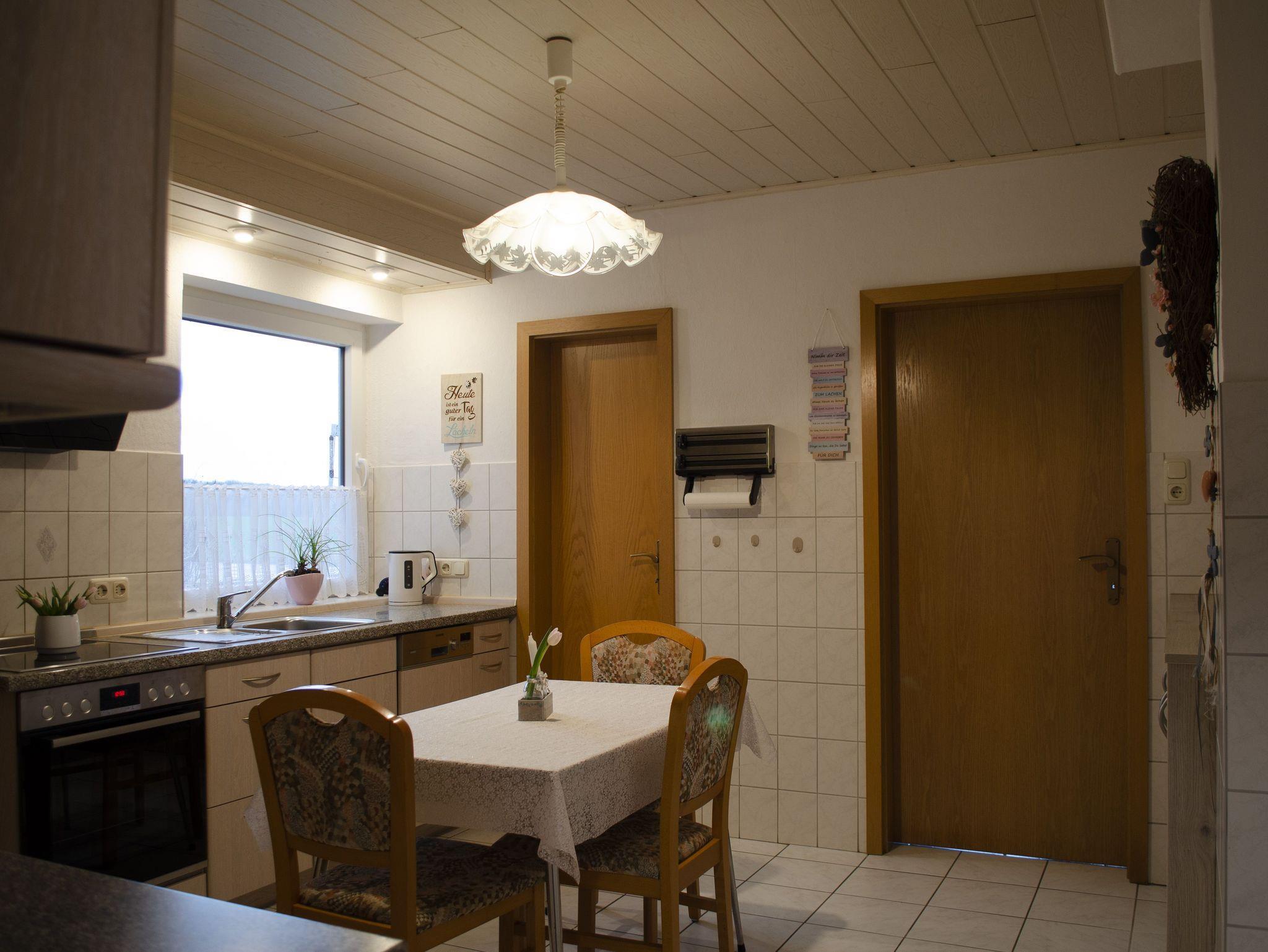 Vom Flur aus gelangt man in die geräumige Küche mit zweigeteilter Küchenzeile. Hier finden Sie alle möglichen Küchenutensilien, um sich zu versorgen. Ceranfeld mit Backofen und Dunstabzugshaube, Spüle sowie Spülmaschine. Ein Wasserkocher, eine Kaffeemaschine sowie ein Kühlschrank und eine Mikrowelle gehören selbstverständlich auch dazu. Ein kleiner Esstisch mit Stühlen lädt zum Frühstücken ein.