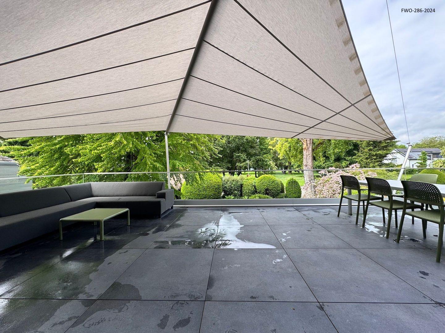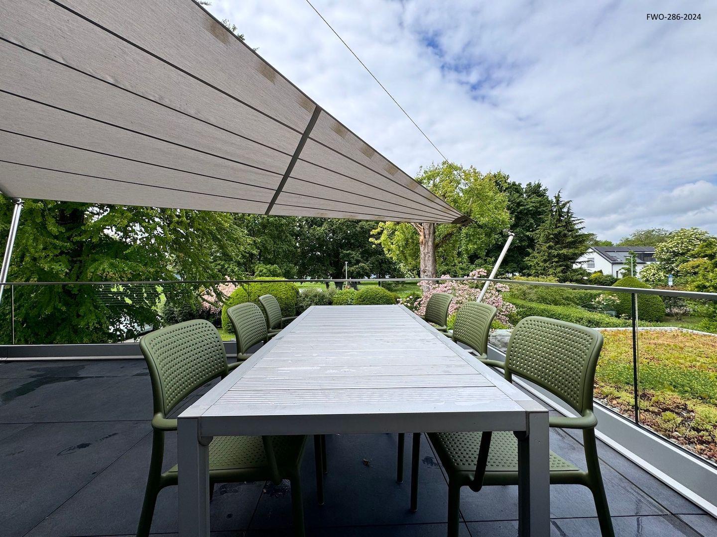 Ein Highlight dieser Ferienwohnung ist die großzügige Terrasse, die mit einem großen Sonnensegel ausgestattet ist. Dieses bietet ausreichend Schatten, sodass Sie auch an sonnigen Tagen gemütlich draußen entspannen können. Die Terrasse eignet sich perfekt für ein Frühstück im Freien oder einen entspannten Abend bei Sonnenuntergang.