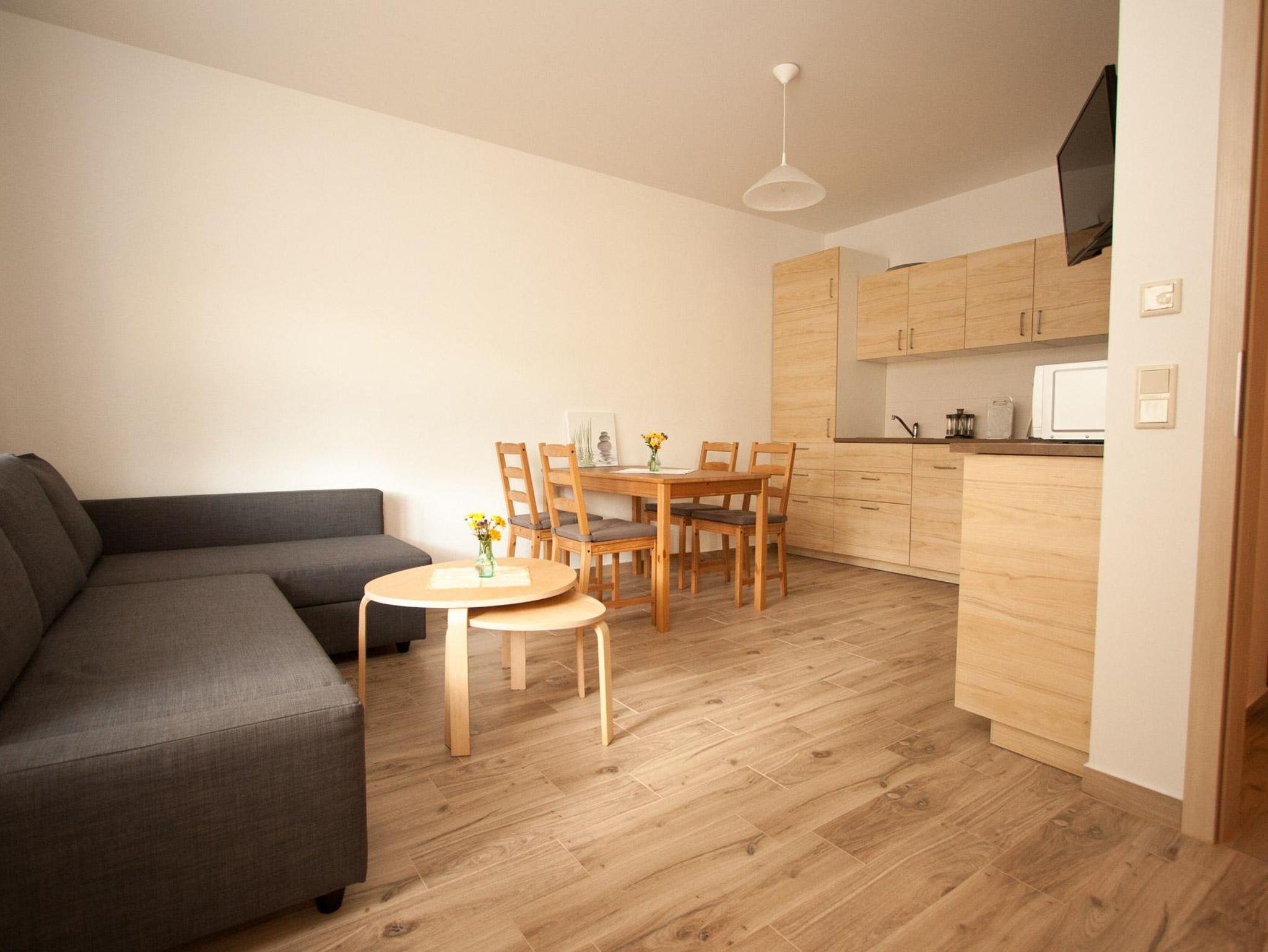 AUSSTATTUNG Aufbettung mögl., Backofen, Bettwäsche, Ceran-Kochfeld, Frühstück hinzubuchbar, Geschirr, großer Kleiderschrank, Kaffeemaschine, komplett eingerichtete Küche, Kühlschrank, Mikrowelle, modernes Bad mit Dusche, Pfannen, Rollstuhlgerecht, Sat-TV, Schlafsofa, Töpfe, WLAN frei