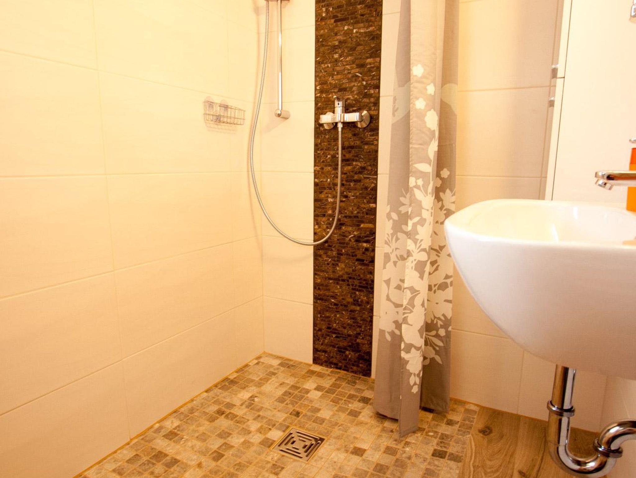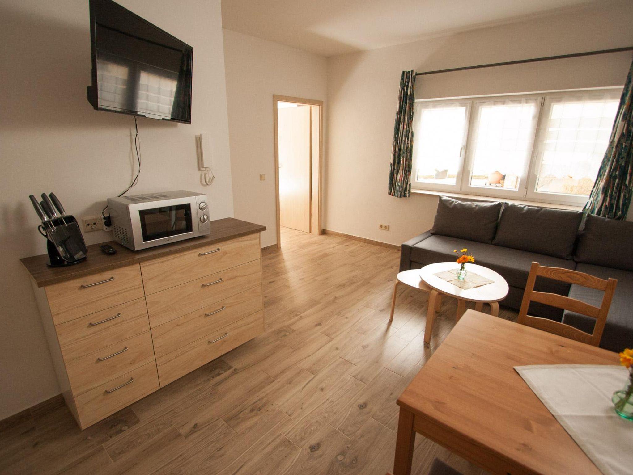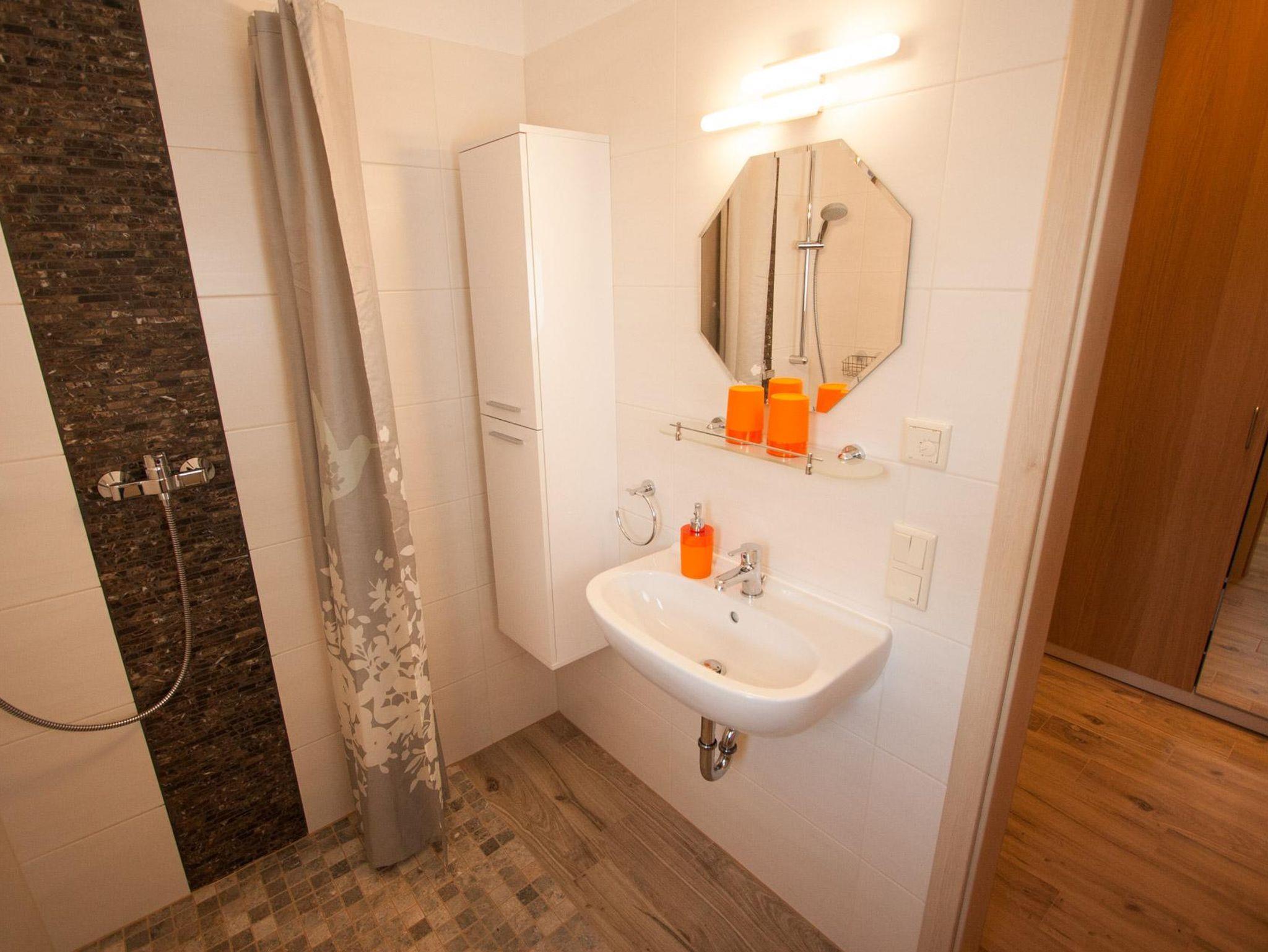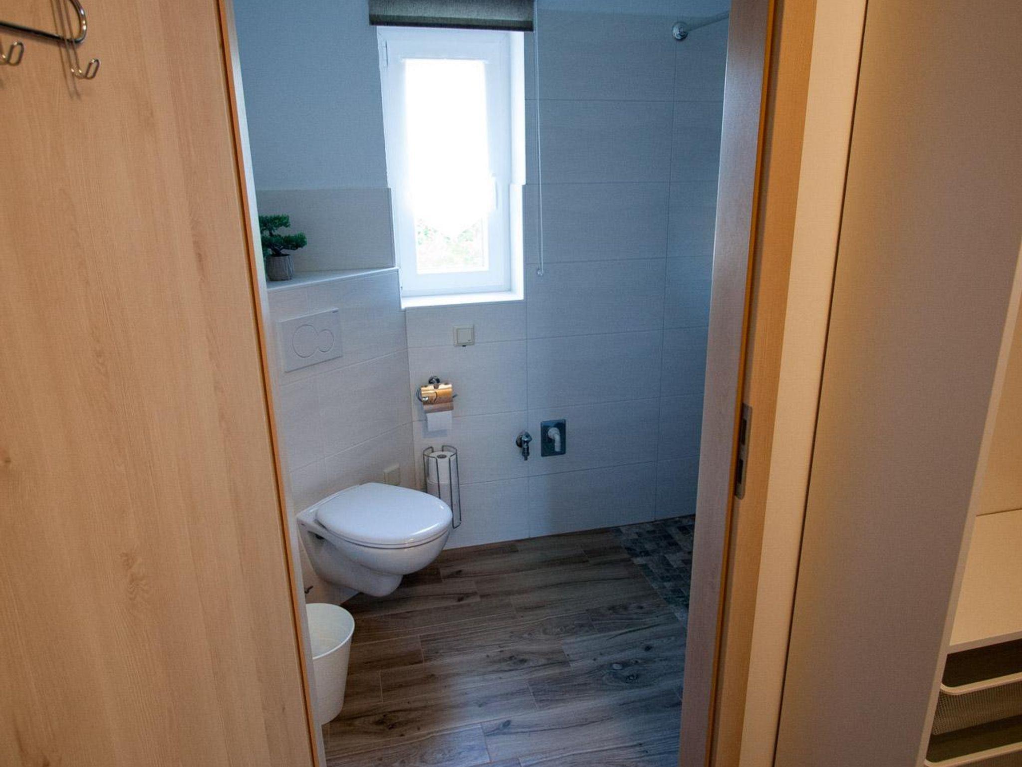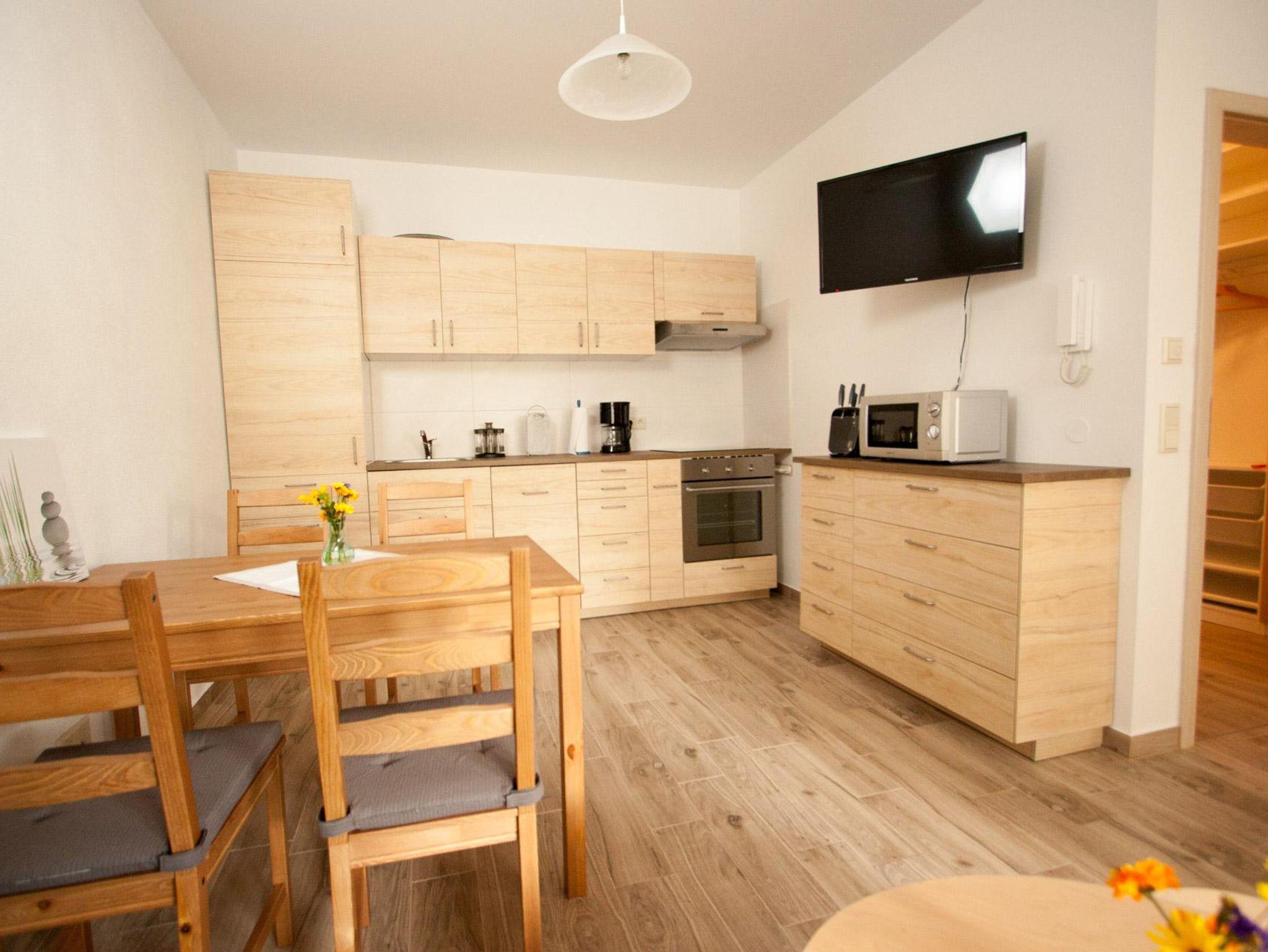 Unsere ebenerdige Ferienwohnung bietet allen Komfort und ist auch Rollstuhl geeignet. Mit einer voll ausgestatteten Küche können Sie sich wunderbar selbst verpflegen. Im gemütlichen Wohn- und Essbereich lädt die große Couch zum relaxen ein und Kleiderschränke bieten viel Platz für Ihr Gepäck. WLAN und Satelliten-TV sind ebenfalls vorhanden. Das Bad glänzt mit einer großen, ebenerdigen Dusche und viel Platz, Handtücher legen wir Ihnen bereit.
