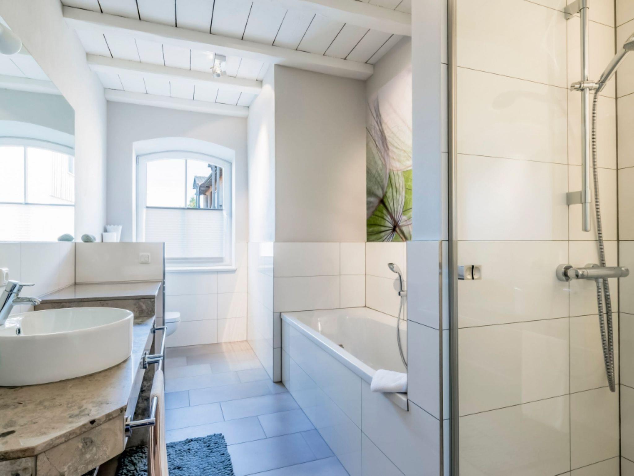 • Modernes Badezimmer: Ausgestattet mit Badewanne, Dusche, Waschtisch und WC für maximale Entspannung.