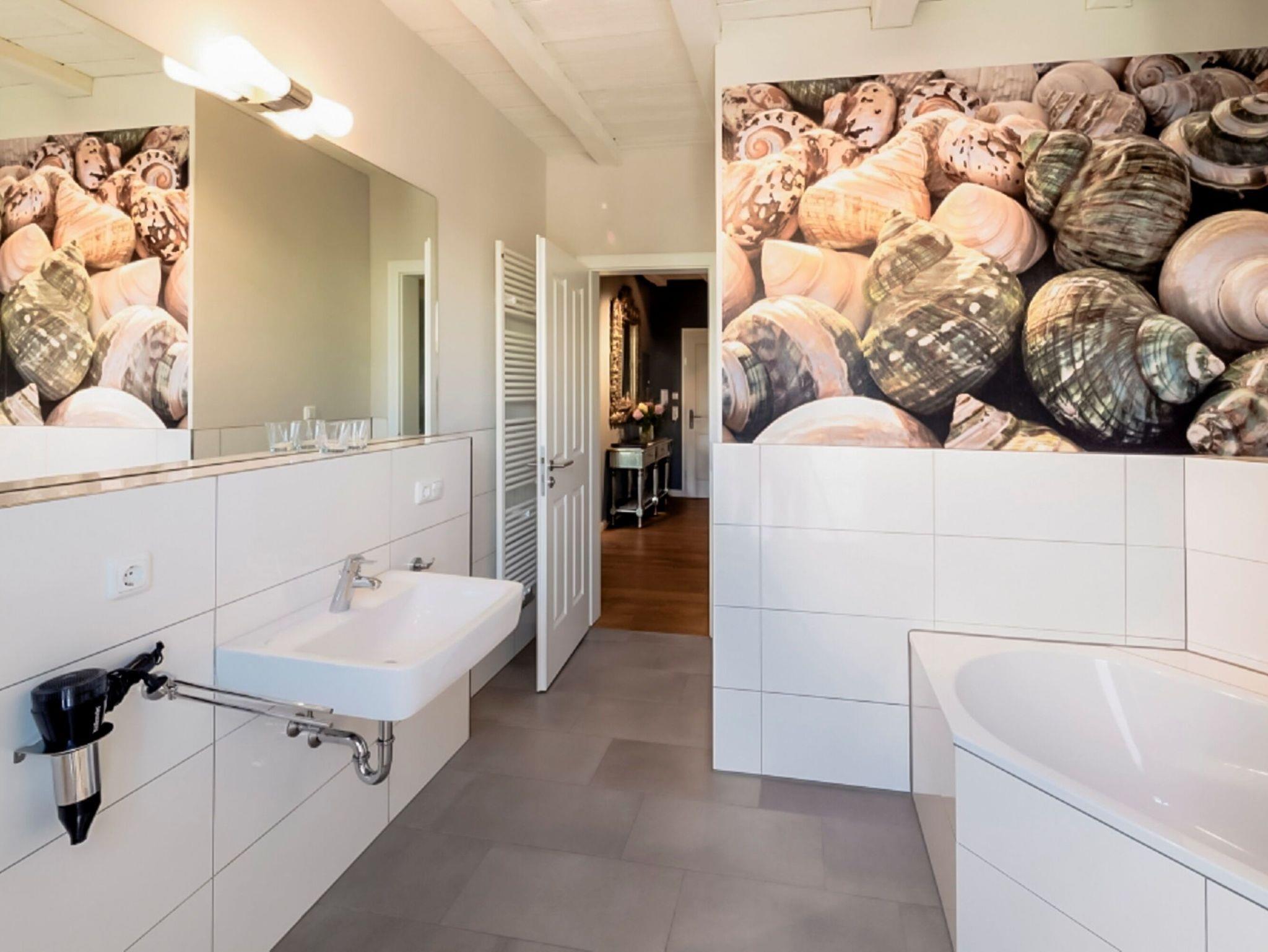 • Luxuriöses Badezimmer: Badewanne, Dusche, Waschtisch und WC sorgen für höchsten Komfort.