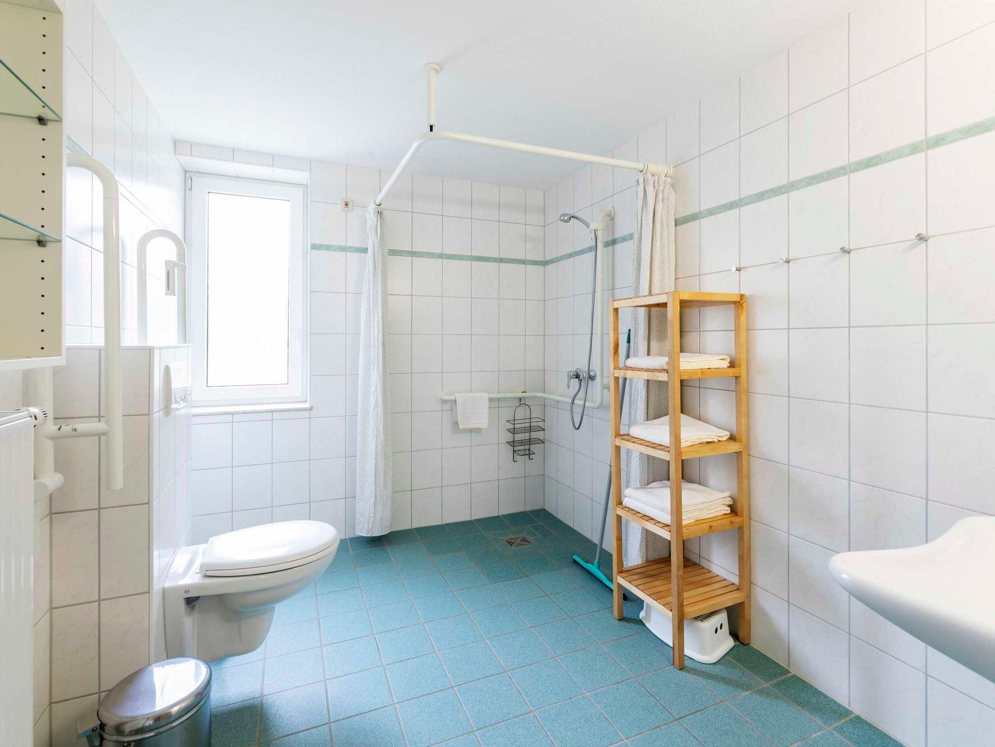 Die barierrefreie Ferienwohnung verfügt über ein Schlafzimmer mit 2 Einzelbetten. Eine zusätzliche Schlafcouch im Wohnzimmer bietet Platz für zwei weitere Personen. Die Ferienwohnung ist über die Terrasse begehbar. Aufgrund der Ausstattung mit Laminatfussboden eignet sie sich optimal für Rollstuhlfahrer und Menschen mit Behinderung. Das großzügige Bad verfügt über eine ebenerdige Dusche und Haltegriffe.