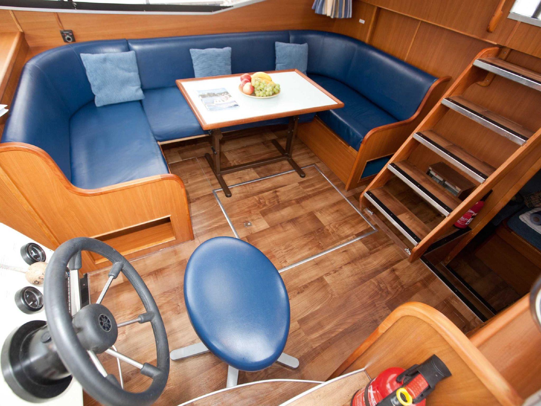 Modernes Hausboot aus Kunststoff (GFK). Ideal für zwei Paare oder Familien. Im Heck Kabine mit Doppelbett oder zwei Einzelbetten, Nasszelle en-suite mit Dusche, WC und Waschbecken, im Bug Kabine mit Doppelbett oder zwei Einzelbetten, Nasszelle mit Dusche, WC und Waschbecken, Mückenschutzgitter an den Fenstern der Schlafkabinen, Salon und Steuerstand mittschiffs erhöht bilden einen großen Raum, bequeme Polsterbänke (ausziehbare Schlafcouch für zwei Personen), 12-Volt-KFZ-Steckdose am Innenfahrstand, Echolot am Außenfahrstand*, voll ausgestattete Pantry, Warmluftheizung in jeder Kabine, zweiter Steuerstand auf dem Sonnendeck mit eingelassener Sitzecke, Bimini, Bugstrahlruder, Treppenzugang zum Heck und zur Badeleiter, Außendusche mit Kalt- und Warmwasser, 230-Volt-Landanschluss und 230-Volt-Inverter (2000 Watt), Steckdosen in allen Kabinen und am Außenfahrstand.