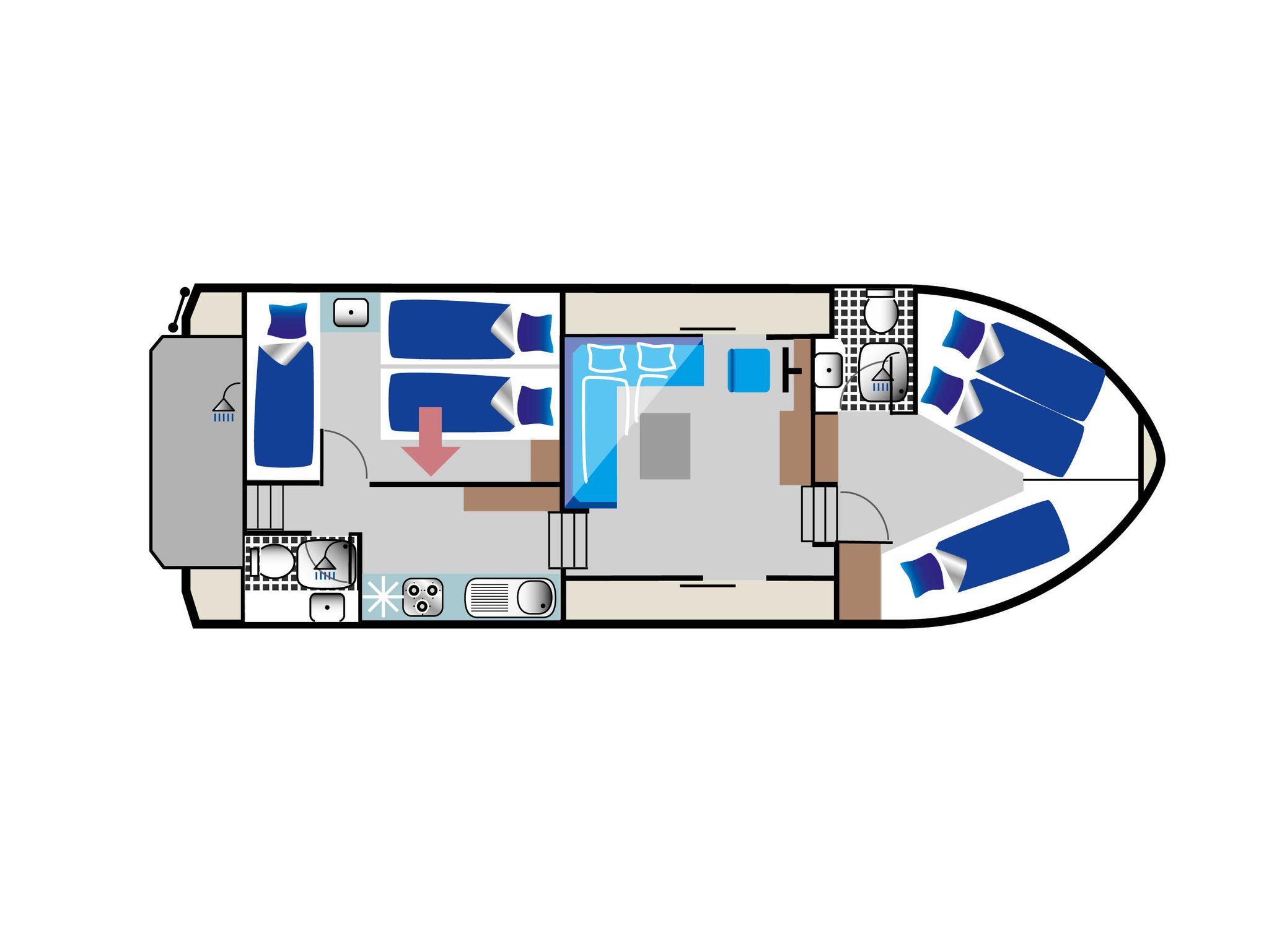Die modern ausgestattete Kormoran 1140 ist das ideale Boot for zwei Paare oder eine Familie. Das Boot hat zwei Kabinen mit jeweils drei Betten. In der Kabine im Heckbereich können 2 Betten leicht zu einem Doppelbett umfunktioniert werden. Jede Kabine hat ein eigenes Bad und Salon und Pantry sind großzügig ausgestattet.