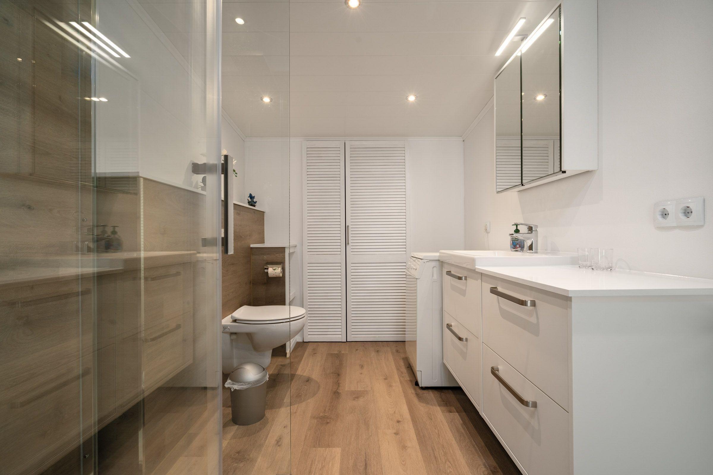 Das Badezimmer verfügt über eine bodengleiche Dusche, ein WC sowie ein Waschbecken und ein Fenster, das für angenehme Lichtverhältnisse sorgt. Ein Haartrockner ist vorhanden.