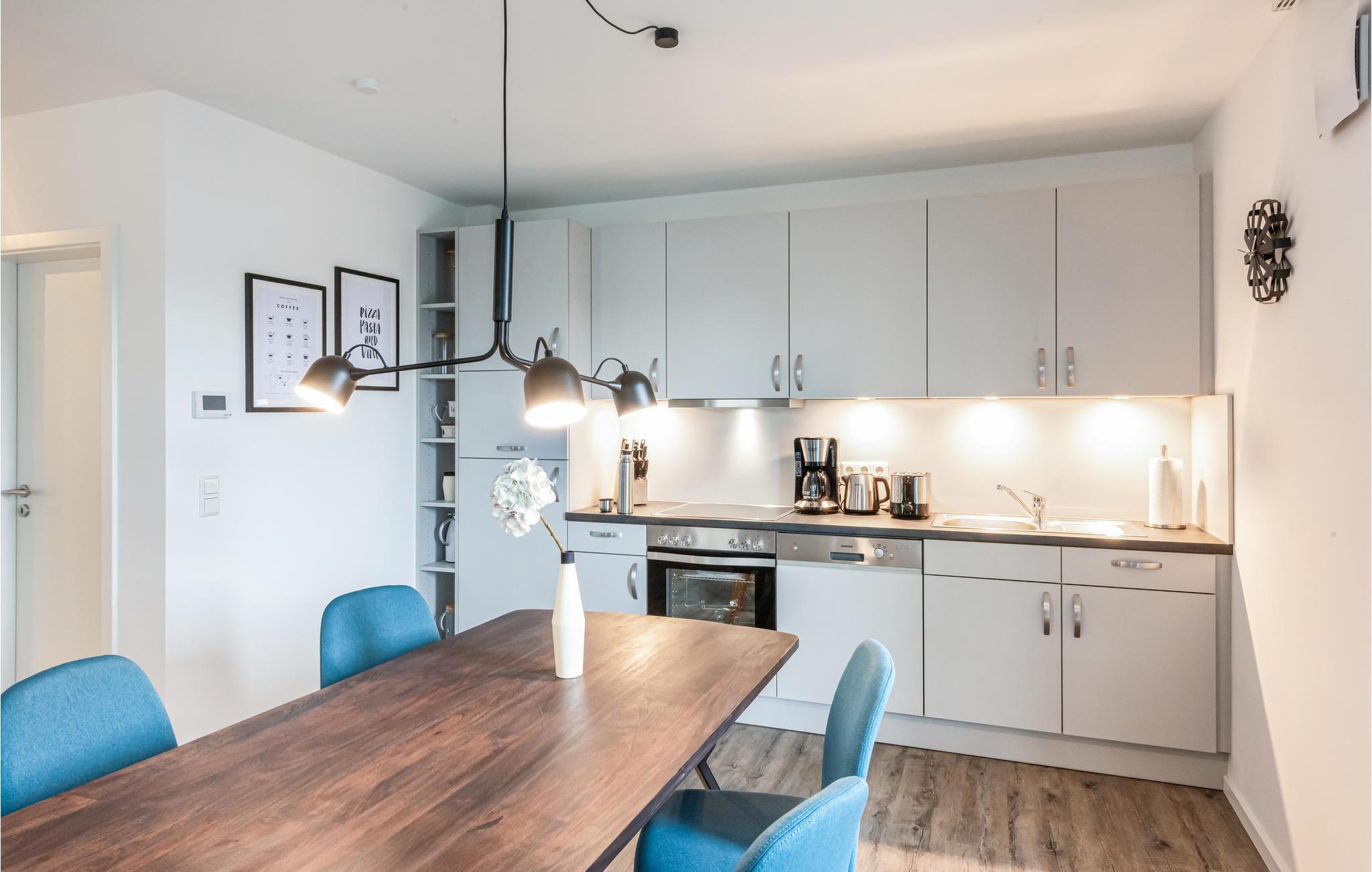Die vollausgestattete Küche lässt keine Wünsche offen. Das Bad ist mit Toilette, Waschbecken und einer großzügigen bodentiefen Dusche ausgestattet.