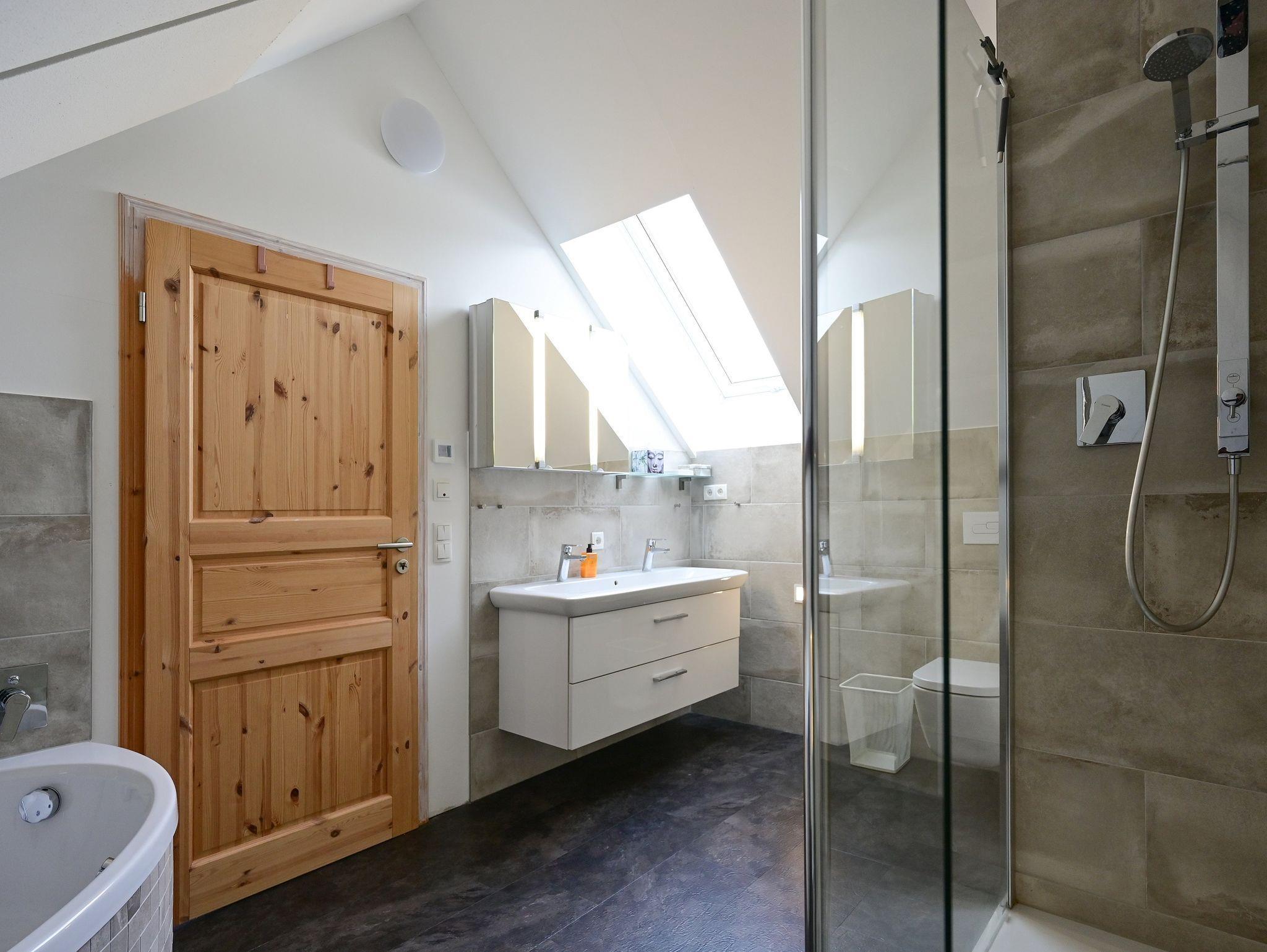 Im Dachgeschoss stehen Ihnen ein geräumiges Schlafzimmer mit Doppelbett 1,60m sowie ein Badezimmer mit Badewanne, Dusche, Doppelwaschbecken und WC zur Verfügung. Für zusätzlichen Komfort sind eine Waschmaschine und ein Wäschetrockner vorhanden. WLAN und ein Smart TV (Streamingdienste möglich) gehören ebenfalls zur Ausstattung.