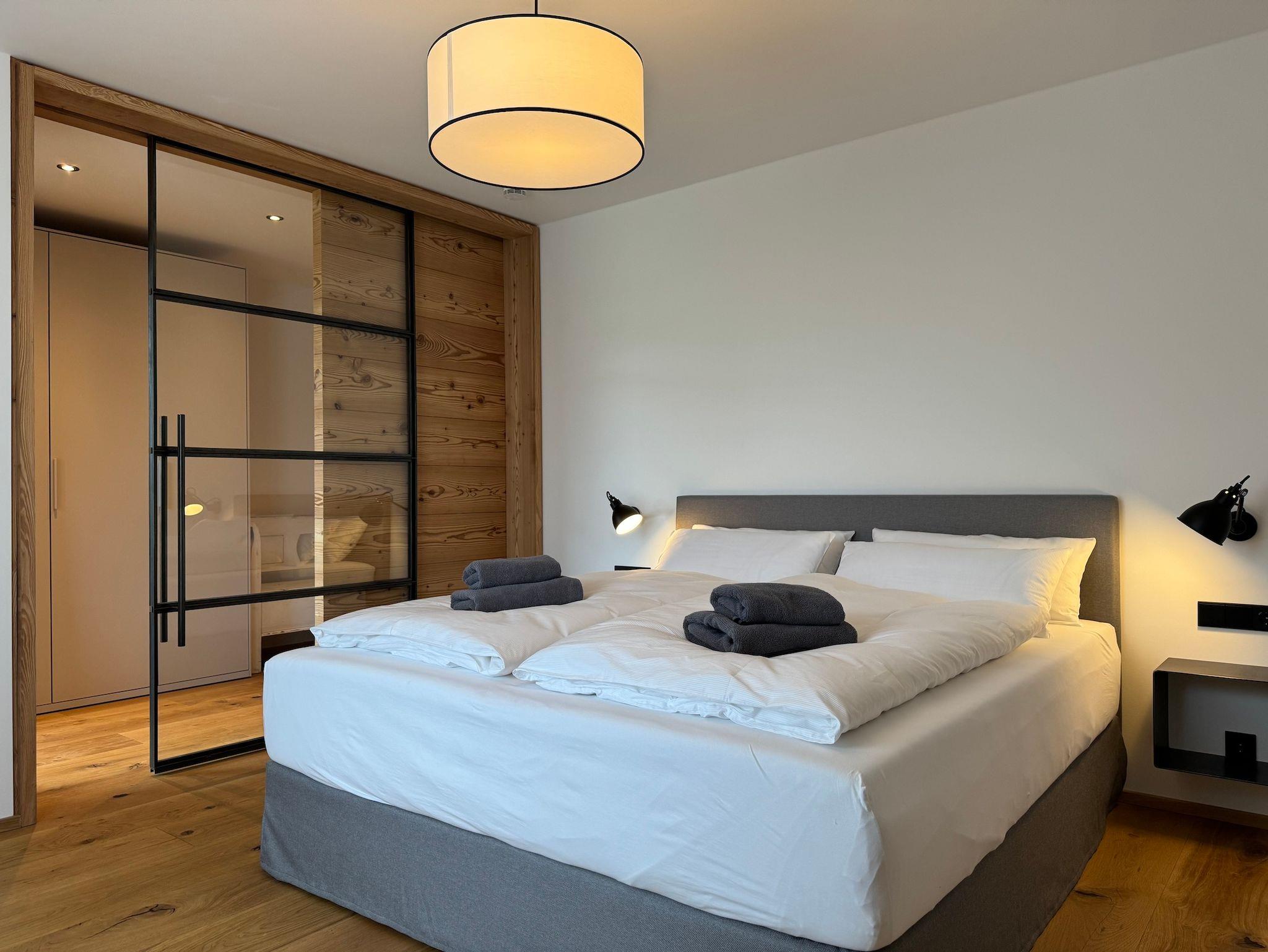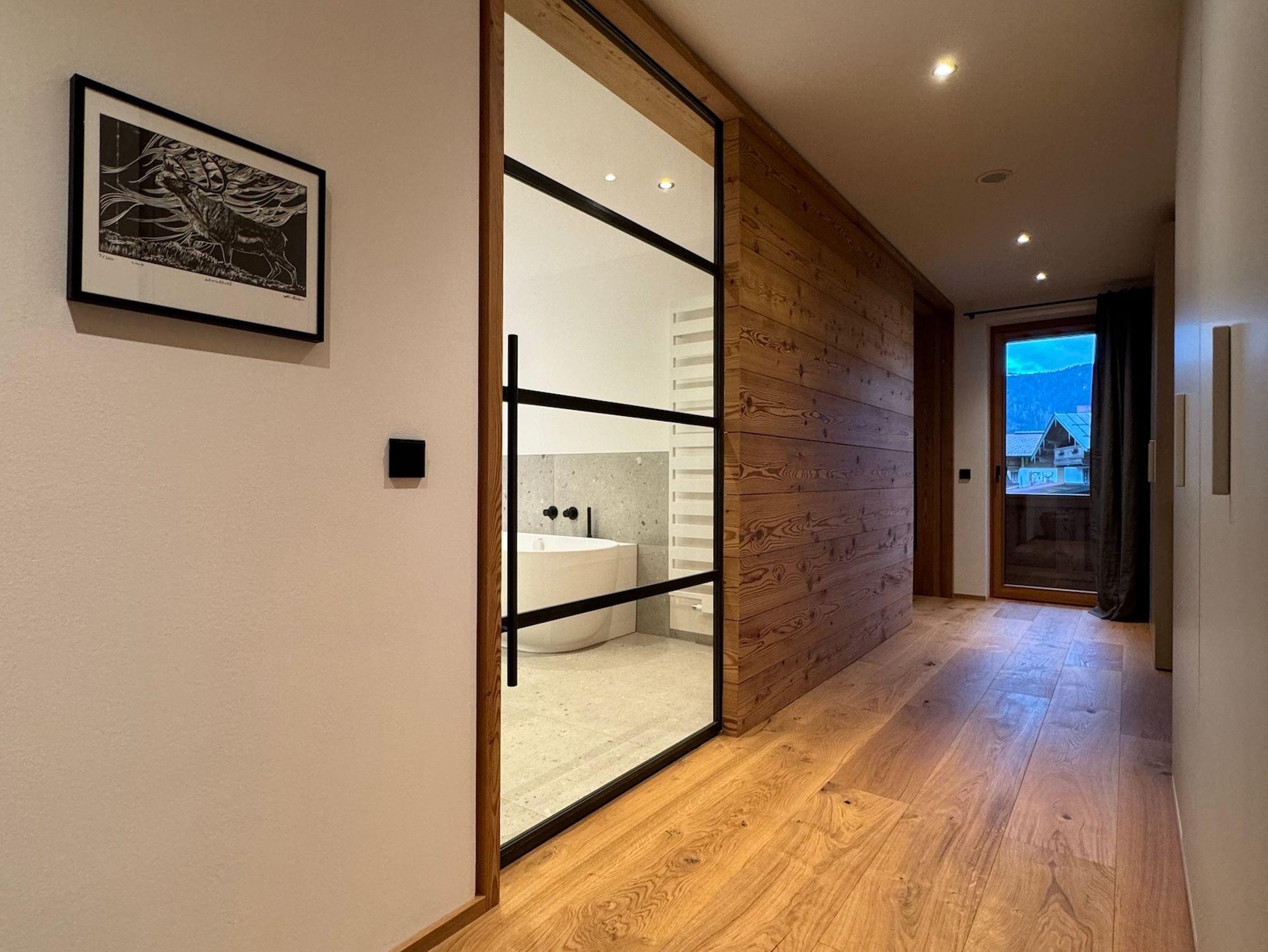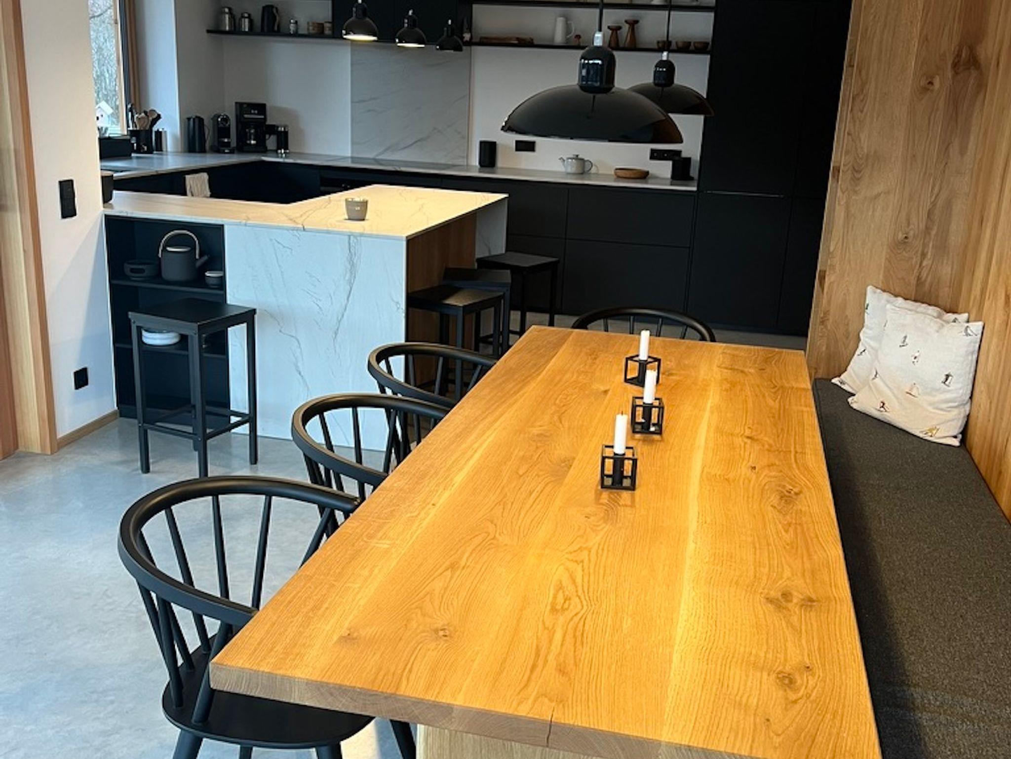 Großzügige 240 qm Wohnfläche bieten viel Platz und Komfort für bis zu acht Gäste. Die luxuriöse, offene Küche mit Theke und großem Esstisch befindet sich im Erdgeschoss. Über große Schiebetüren gelangt man auf die sonnige Terrasse und in den Garten. Das weitläufige Wohnzimmer im Obergeschoss, ebenfalls mit großen Schiebetüren zum umlaufenden Balkon, bietet viele gemütliche Sitzmöglichkeiten, einen großen Kamin mit Kaminbank und besticht durch die enorme Raumhöhe in das offene Gebälk des Dachstuhls. Vier Schlafzimmer, drei Badezimmer und ein Gäste-WC verteilen sich auf die beiden Etagen des Ferien-Chalets. Komplettiert wird die grosszügige und luxuriöse Ausstattung durch eine große finnische Sauna im Obergeschoss, die Doppelgarage mit Wallbox und die über das lokale Naturwärmewerk gespeiste Fußbodenheizung.