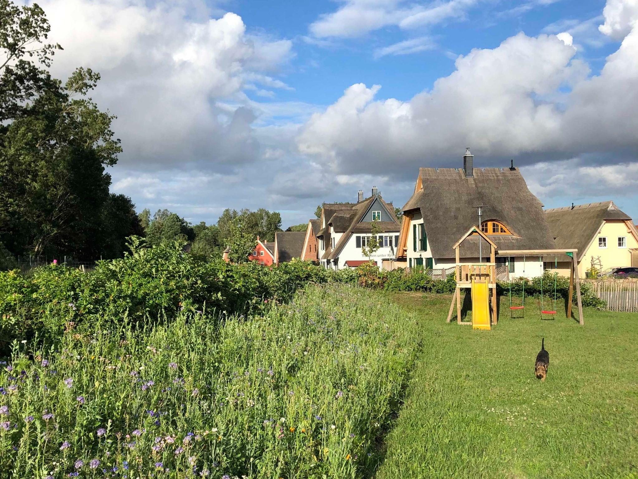 Ostseeurlaub unter Reet im komfortablen 6-Raum-Ferienhaus für 10 Personen mit 5 Schlafräumen, 3 Duschbädern und 2 Sonnenterrassen. Im verkehrsruhigen Ferienpark am ruhigen Ortsrand des Ostseebades Rerik. Komplett umzäuntes 800m² Gartengrundstück, ideal für Urlaub mit Hund und Kindern und gemeinsam reisende Familien. Ruhige Lage direkt am Wander- und Radweg zum Ostseestrand ohne störenden Durchgangsverkehr.