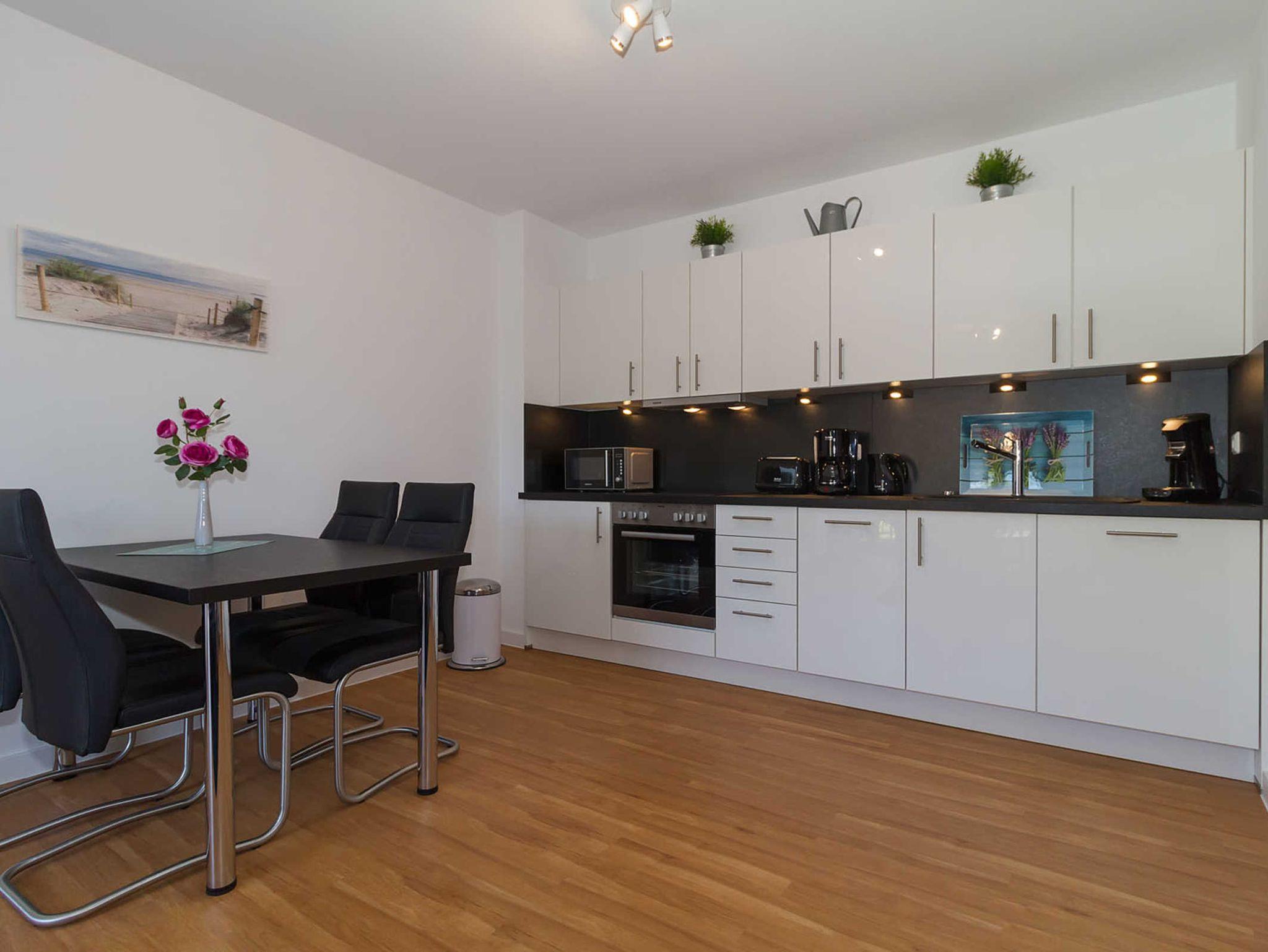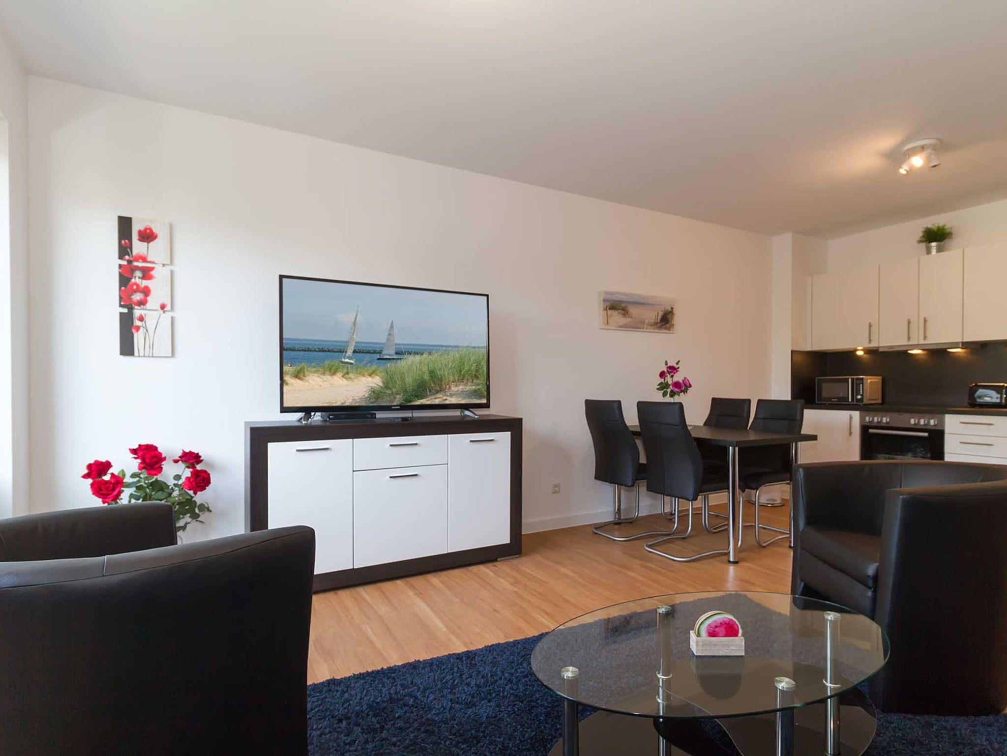 Im Wohn- und Essbereich finden Sie eine vollausgestattete moderne Einbauküche. Ein weiterer Fernseher (großer Smart-TV) bietet Ihnen die Möglichkeit zur Unterhaltung. W-LAN können Sie kostenlos nutzen.