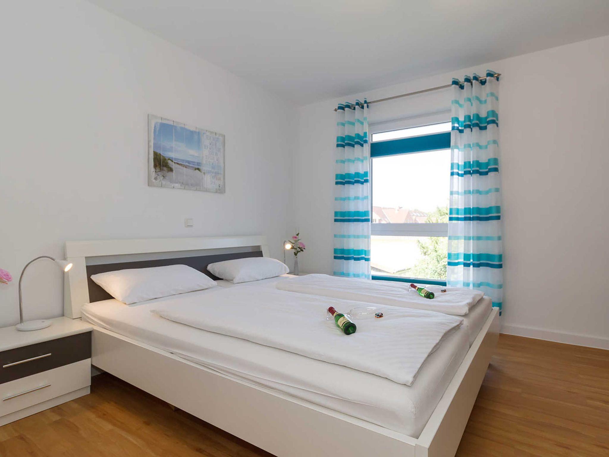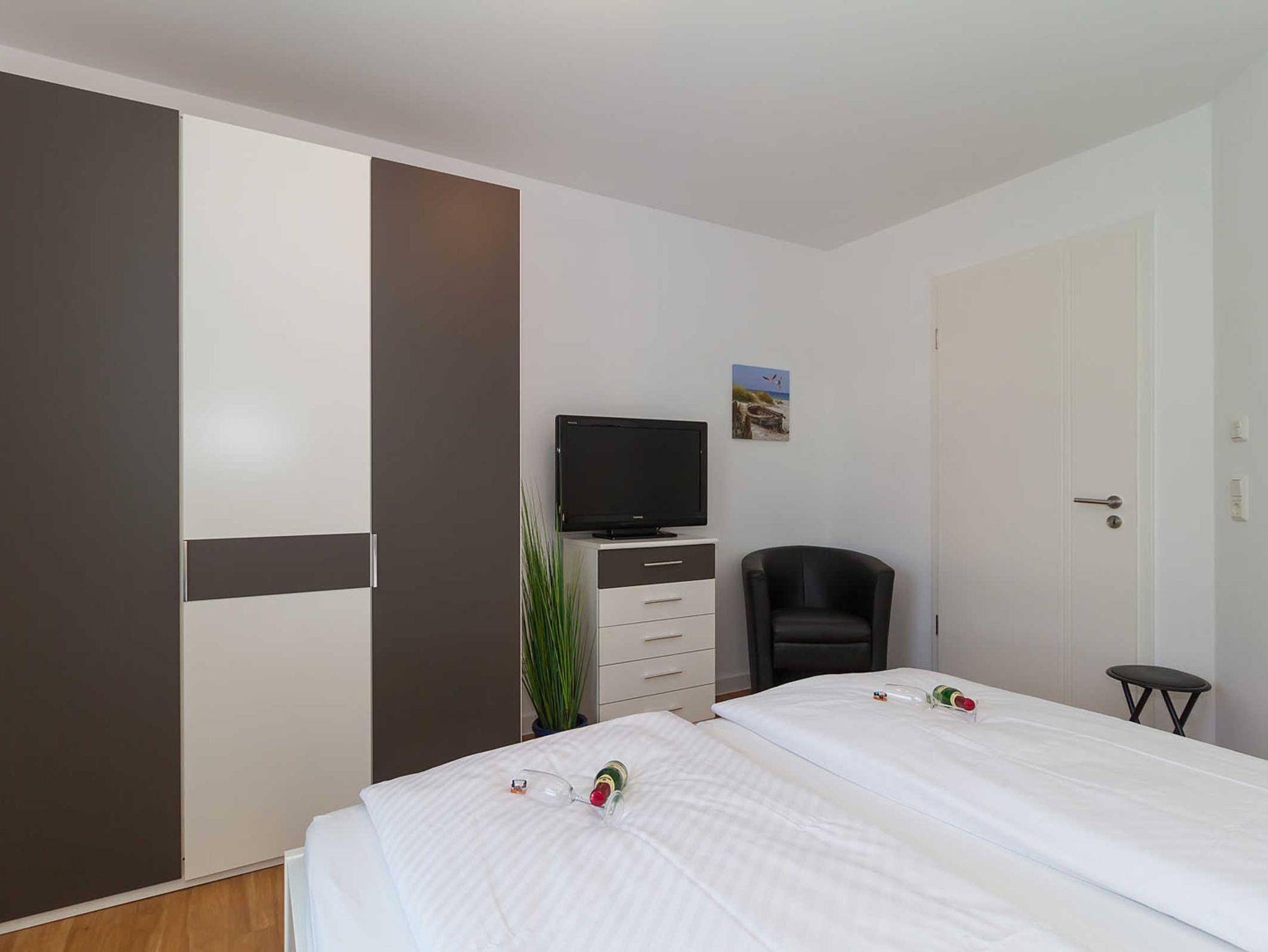 In der Ferienwohnung Ostseebrise erwartet Sie ein Schlafzimmer mit großem Doppelbett (180 x 200) und Flachbildschirm.