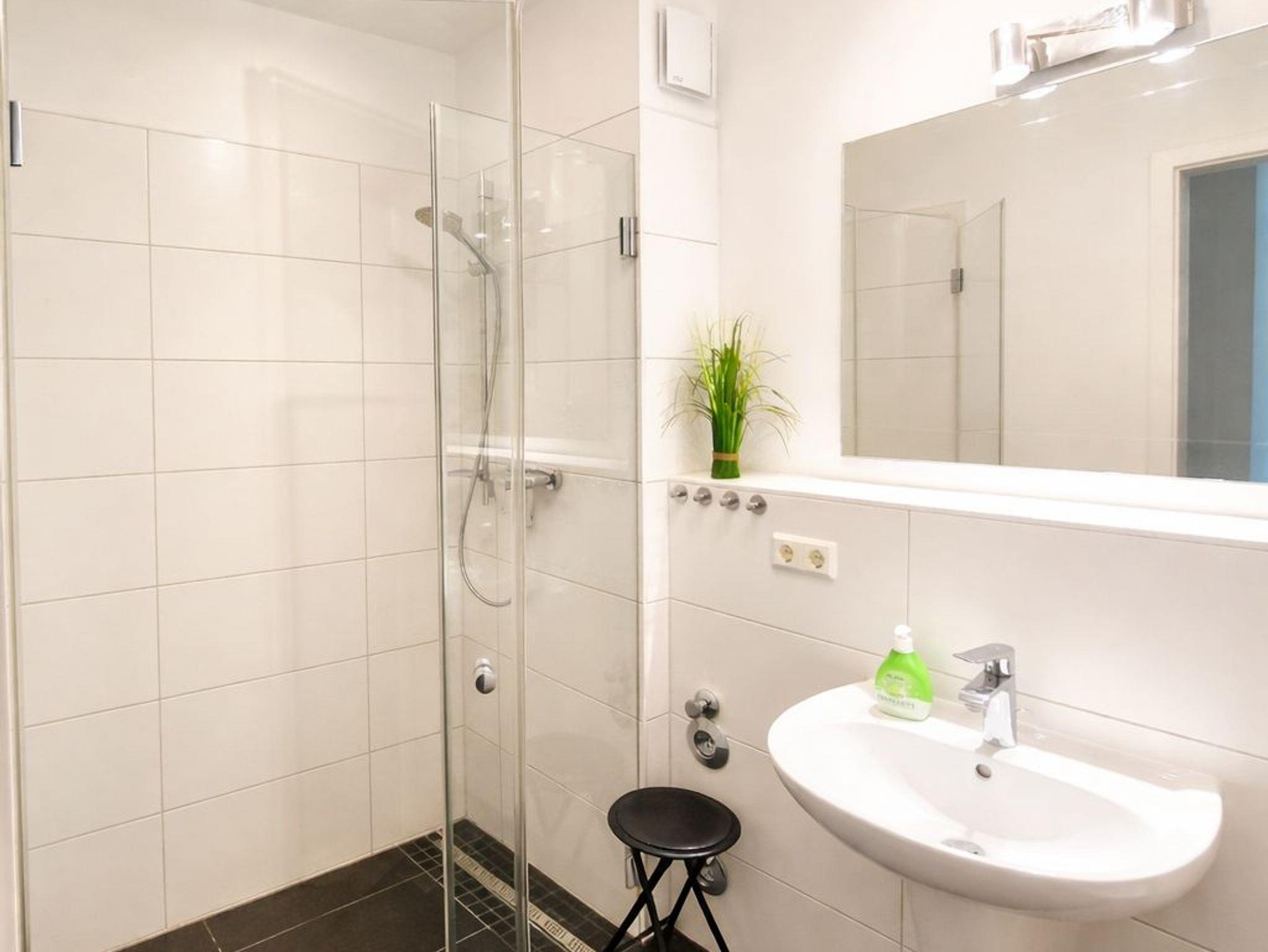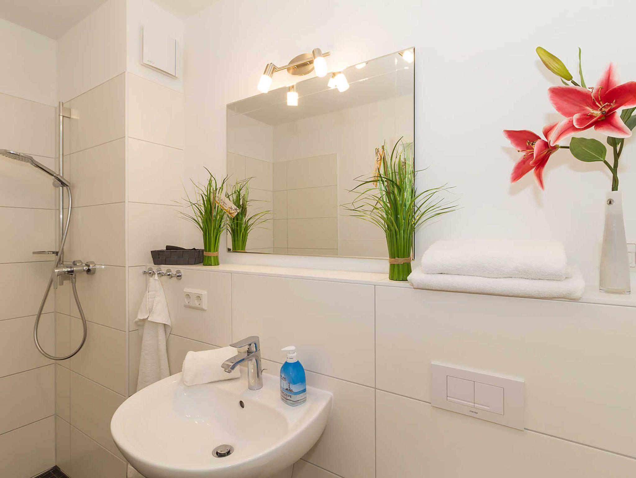 Das Badezimmer verfügt über eine ebenerdige Dusche für den bequemen Einstieg. Ein Fön liegt für Sie bereit.