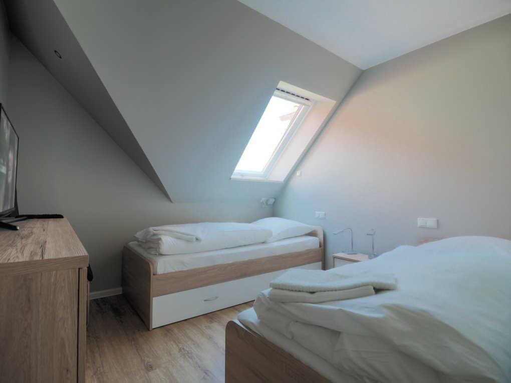 Gemütliche 3-Zimmer-Wohnung im Obergeschoss mit offener Wohnküche, Schlafsofa und zwei Schlafzimmern mit TV. Westbalkon mit Gartenmöbeln für wunderschöne Sonnenuntergänge. Duschbad mit Tageslicht, Gäste-WC, Abstellkammer, Fahrradschuppen und PKW-Stellplatz inklusive.