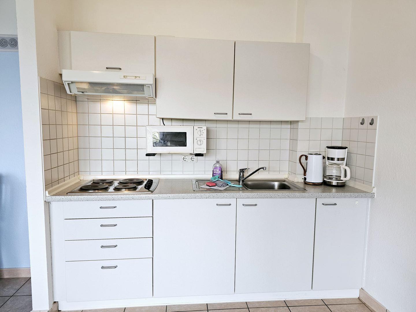 Die Küche ist modern ausgestattet und bietet alles, was Sie für Ihren Aufenthalt benötigen: Cerankochfeld, Backofen, Geschirrspüler, Kühlschrank mit Gefrierfach sowie Kaffeemaschine, Toaster und Wasserkocher. Das Schlafzimmer ist mit einem bequemen Doppelbett und ausreichend Stauraum eingerichtet und sorgt für erholsamen Schlaf. Im Wohnbereich lädt eine gemütliche Couch zum Entspannen ein – ideal für Lesestunden oder Filmabende.