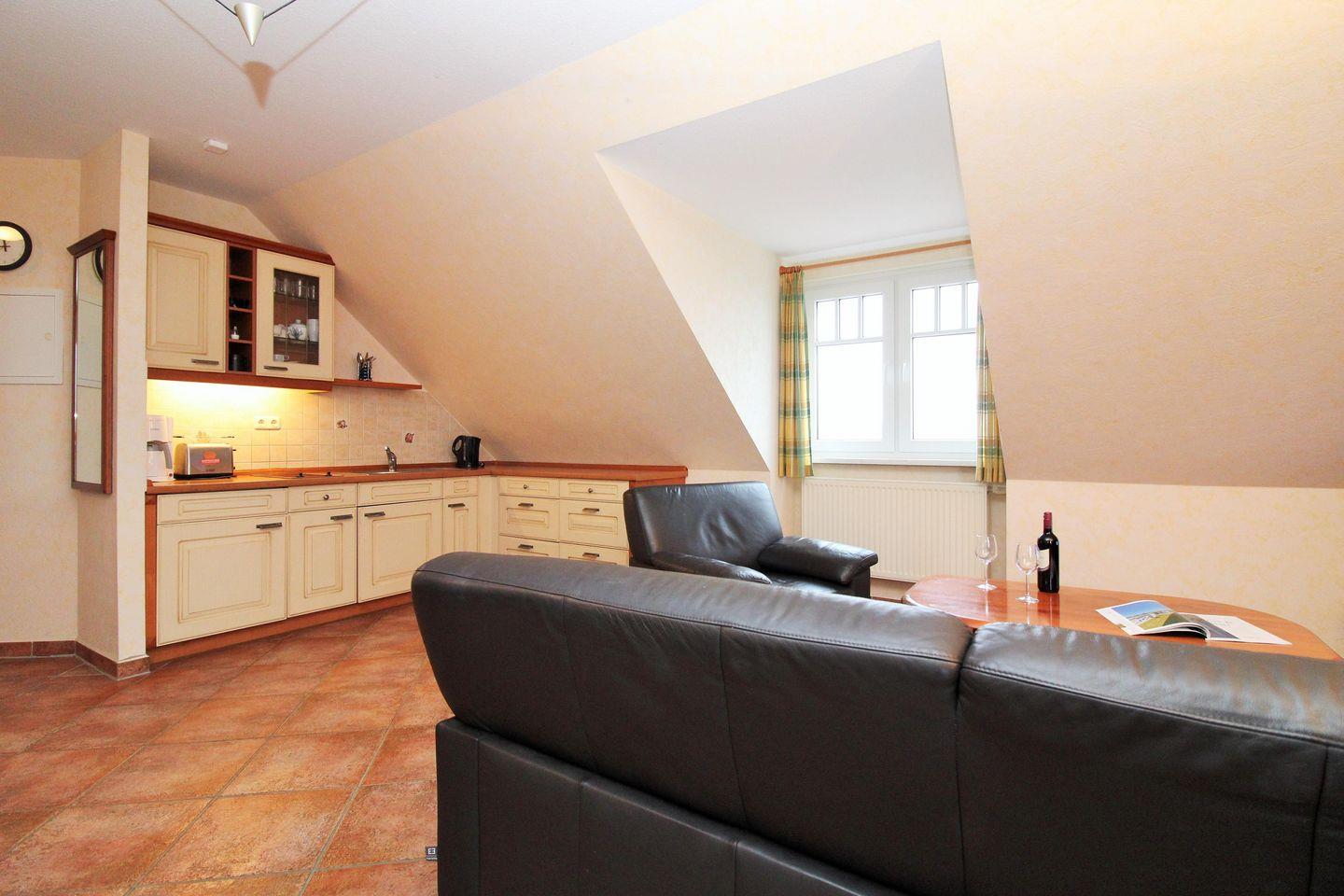 Das helle Wohn- und Esszimmer lädt mit gemütlicher Sitzgruppe, Esstisch und direktem Zugang zum großzügigen Balkon zum Entspannen ein. Hier lassen sich sonnige Frühstücke oder laue Abende mit Blick auf das Wasser genießen. Eine moderne Einbauküche mit 2-Platten-Cerankochfeld, Mikrowelle und Kühlschrank mit Gefrierfach bietet alles, was Sie für Ihre Urlaubsküche brauchen.