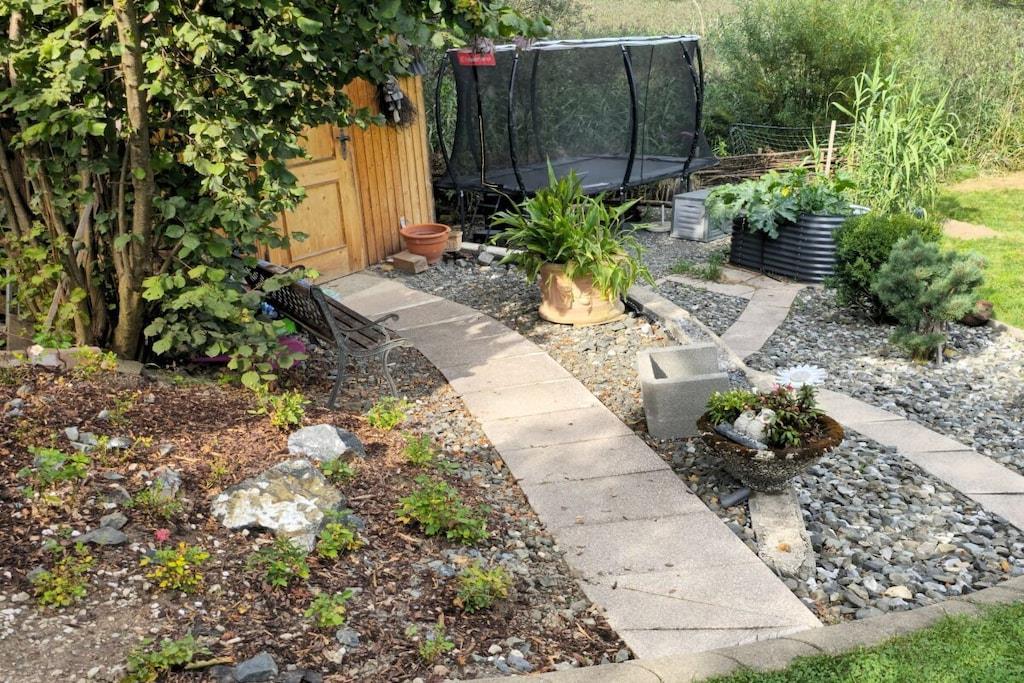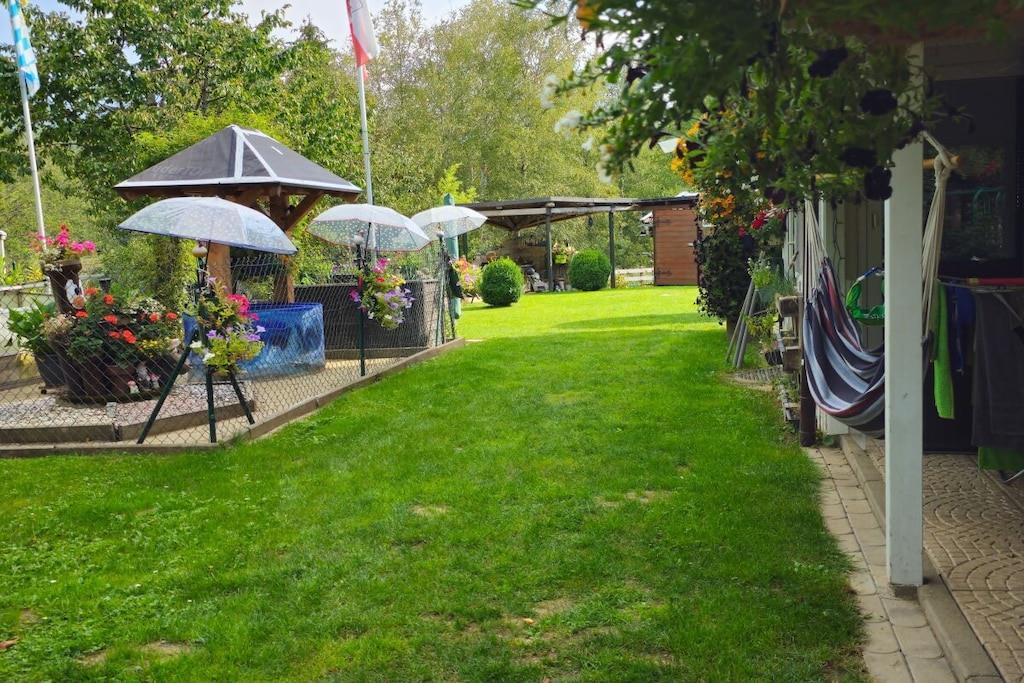 Parterre: (Wohnzimmer(, Bibliothek, Schlafcouch 1 Pers., TV, Radio), Küche(, , , , Kochnische, Esstisch, Herd, Kochplatte, Wasserkocher, Toaster, Toaster, Kaffeemaschine, Backofen, Mikrowelle, Kühlschrank, Tiefkühlschrank, Küchenmaschine), Schlafzimmer(, , , , Doppelbett), Schlafzimmer(, , , , Doppelbett), Badezimmer(, Toilette, Dusche, Waschbecken, Föhn)) , , Veranda(Gartenmöbel, Liegen), Carport, Internet, Heizung, Terrasse(Gartenmöbel), Garten(, Zentraler Grill, Tischtennis, Liegewiese, Grill, Gartenmöbel, Trampolin, Teich, Rutsche, Gartenhaus, Schaukel), Parkplatz, Bügelbrett, Bügeleisen, Trockenschrank