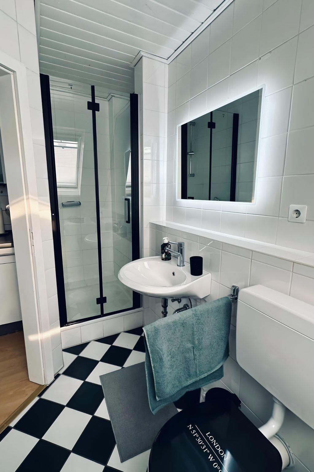 Innen besticht die Wohnung durch ein helles und modern eingerichtetes Schlafzimmer, das Ruhe und Komfort verspricht. Der großzügige Wohn- und Essbereich, ausgestattet mit einem großen Fenster, ermöglicht jederzeit den natürlichen Ausblick auf die umgebende Landschaft. Die Küche lässt keine Wünsche offen: sie ist voll ausgestattet mit modernen Annehmlichkeiten wie einer Spülmaschine, einem Wasserkocher und einer Waschmaschine zur alleinigen Nutzung. Das Badezimmer ist modern gestaltet und verfügt über eine funktionale Dusche.