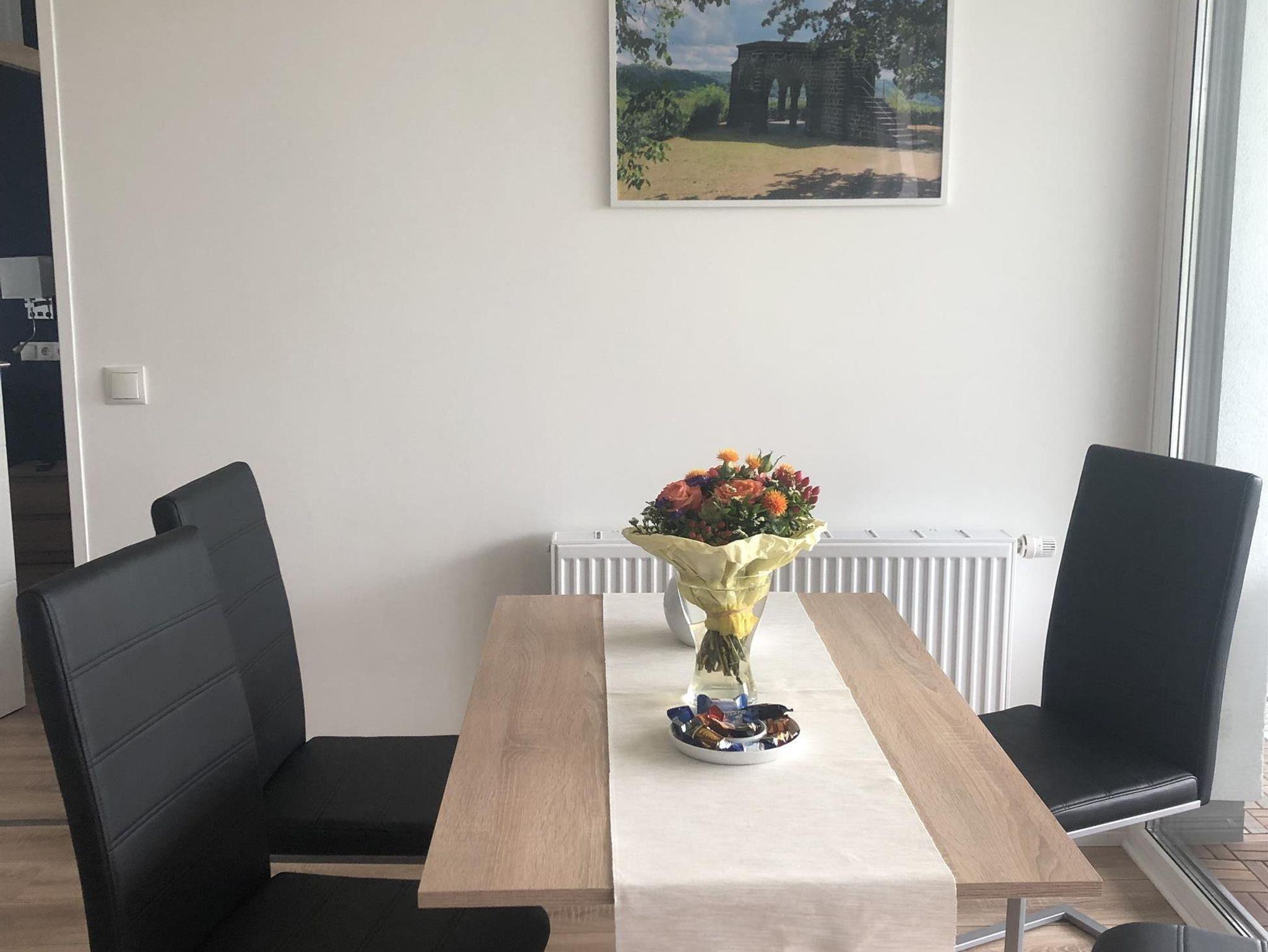Die Wohnung Wolfsdelle im Untergeschoss des Hauses bietet mit ihren 65 m² ausreichend Platz für einen erholsamen Urlaub zu Zweit. Aus dem großzügigen Wohnzimmer mit Kamin bietet sich ein Blick in den gemütlichen Garten. Von dort kann man auch einen Blick auf den Rhein Richtung Koblenz erhaschen. Der Essbereich grenzt dirkt an die große überdachte Terrasse an. Die modern eingerichtete Küche bietet zusätzlich einen Sitzbereich. Sie ist mit Spülmaschine, Herd, Ofen und Mikrowelle voll ausgestattet.