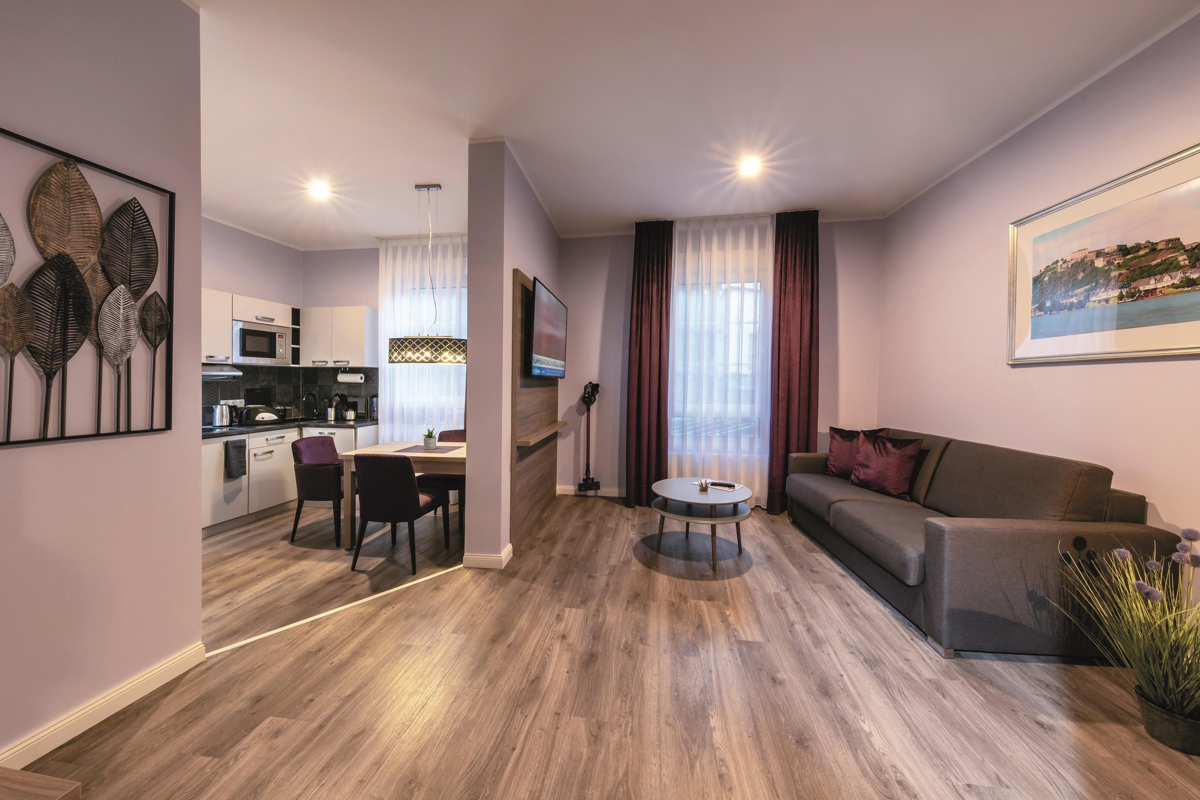 Das Haus Burgenheimat befindet sich im malerischen Ortskern von Rhens, einem historischen Städtchen zwischen Koblenz und Boppard. Die 8 liebevoll eingerichteten Apartments im Haus gehören zum AKZENT Hotel "Roter Ochse" direkt nebenan und haben ein komfortables Schlafzimmer mit überlangem Bett, ein modernes Badezimmer und einen gemütlichen Wohnbereich mit integrierter Küche und Essbereich.