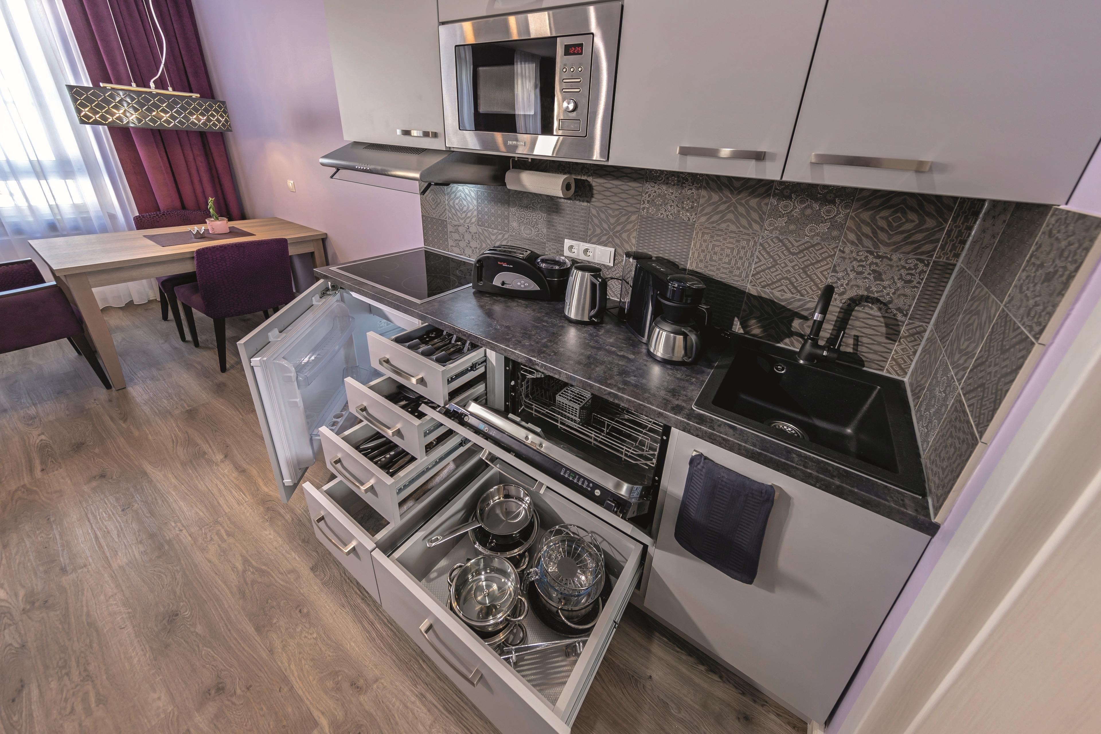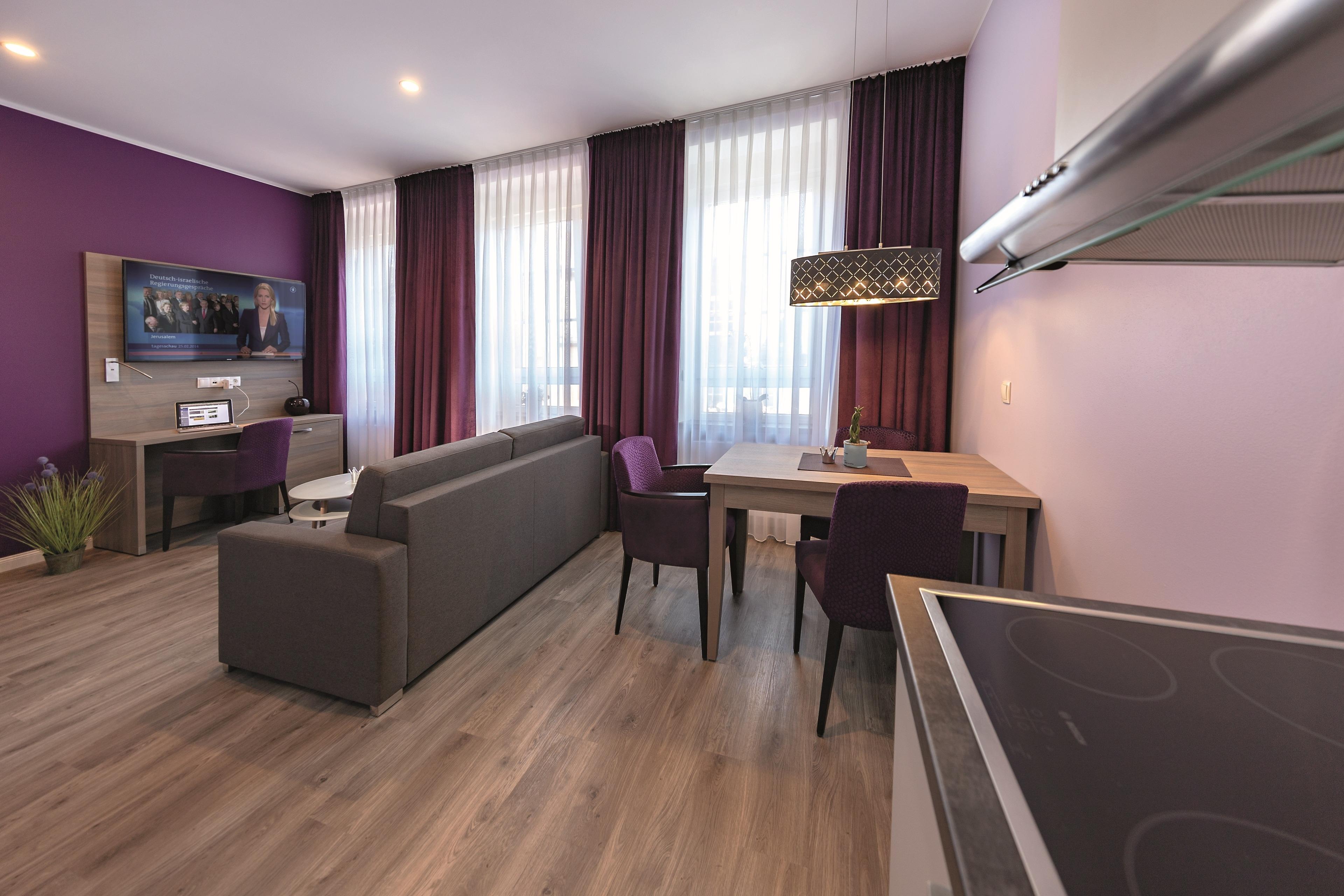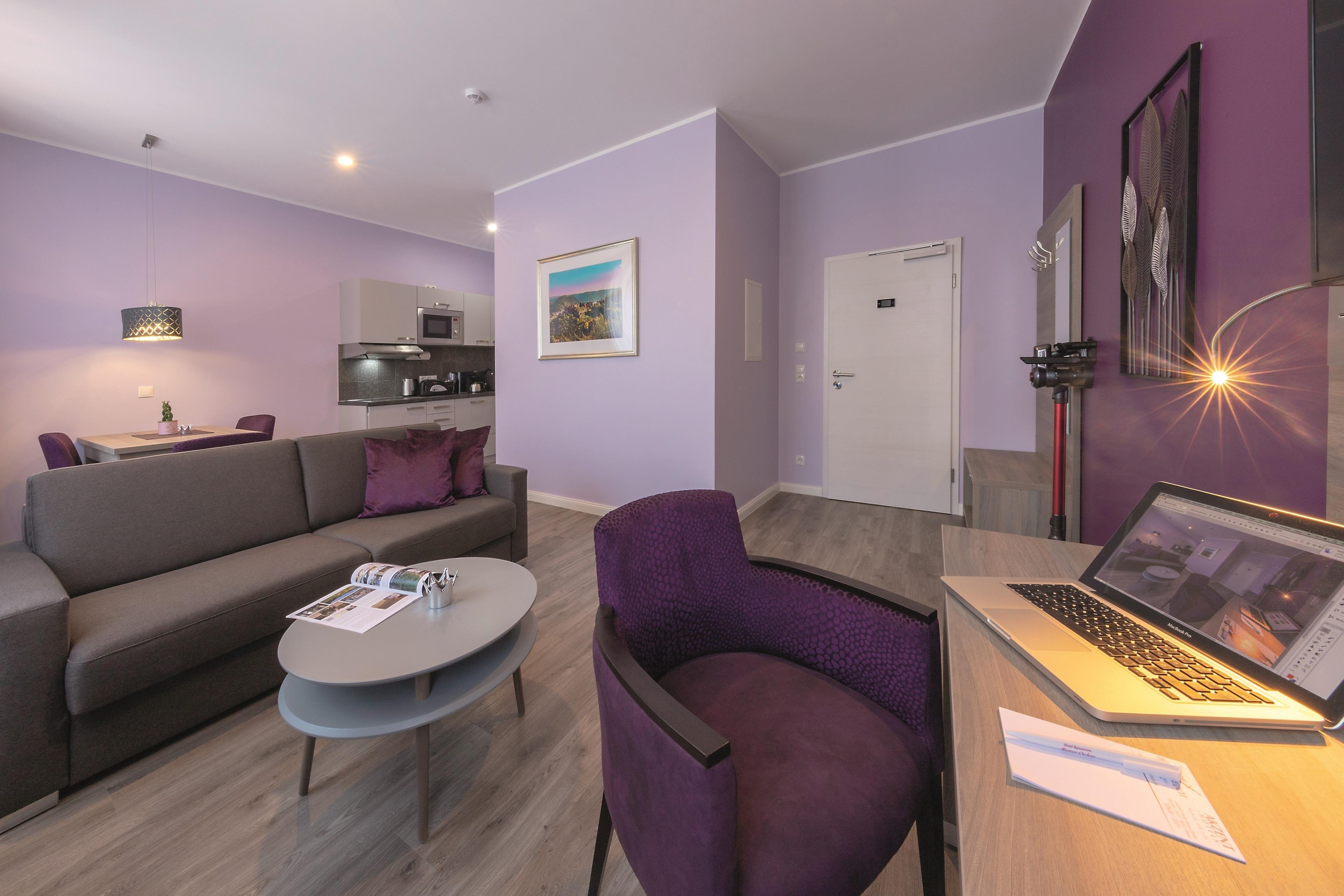 Im Haus Burgenheimat befinden sich 8 Apartments: 2 Princesize-Apartments F**** (20 - 30 m²), 1 Queensize-Apartment F*** (25 m²), 2 Queensize-Apartments F**** (30 - 40 m²) und 3 Kingsize-Apartments F**** (40 - 50 m²). Schlafen Sie wie ein König in den komfortablen überlangen Boxspringbetten (2,20 m) der Premium-Marke Royal Bedding®. Die Bettbreite beträgt in den Princesize-Apartments 1,00 m, in den Queensize-Apartments 1,60 m und in den Kingsize-Apartments 2,00 m. Alle Betten haben eine durchgängige extrahohe Matratze für besonderen Schlafkomfort. Im „Thronsaal“, dem modernen Badezimmer, erwartet Sie ein WC mit integrierter Lüftung, ein stilvolles Waschbecken und eine bodengleiche Dusche mit Regenbrause und Handbrause. Die Küche ist mit allem, was man braucht, ausgestattet. Bereiten Sie sich z.B. ein leckeres Frühstück mit dem Tefal Toast'n'Egg und brühen sich Ihren Kaffee mit der Senseo Switch entweder mit Filter oder mit Kaffeepad. Auf dem 4-Platten-Cerankochfeld lassen sich auch komplette Menüs zubereiten. Eine Mikrowelle mit Grillfunktion sorgt für Essen in Minutenschnelle. Und damit der Abwasch nicht lästig wird, steht eine kompakte Geschirrspülmaschine bereit. Durchdachte Annehmlichkeiten erwarten Sie in jedem Raum der Apartments: ein digitaler Türspion, USB-Anschlüsse an den Leuchten am Bett sowie am Schreibtisch, eine integrierte Toilettenlüftung, eine bodengleiche Dusche mit Regenbrause, ein Laptop-Safe, überlange Betten, extrahohe Matratzen, große UHD-Smart-TVs, vollausgestattete Küche inkl. kompaktem Geschirrspüler. Neben der Selbstverpflegung besteht die Möglichkeit am Frühstücksbuffet des Hotels teilzunehmen. Als Gast erhalten Sie außerdem für die Dauer Ihres Aufenthalts ein kostenfreies Gästeticket für die Nutzung des ÖPNV im Gebiet des VRM.