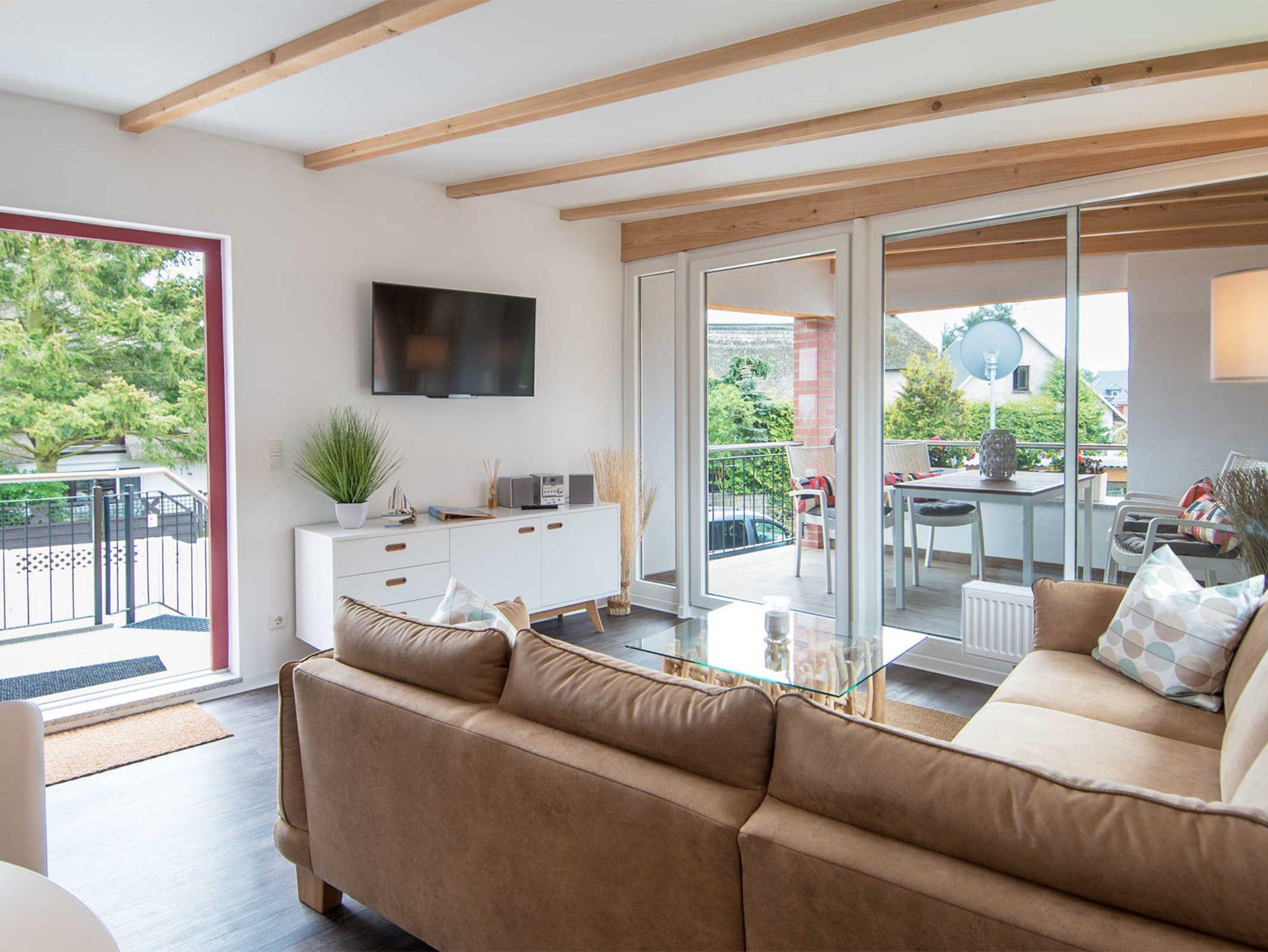 Über eine Außentreppe gelangen Sie in die Ferienwohnung. Nun betreten Sie den Wohnbereich mit integrierter Einbauküche und Essplatz. Der Wohnbereich verfügt über eine gemütliche Eckcouch mit Couchtisch, einem Sideboard und einem Flachbildfernseher.