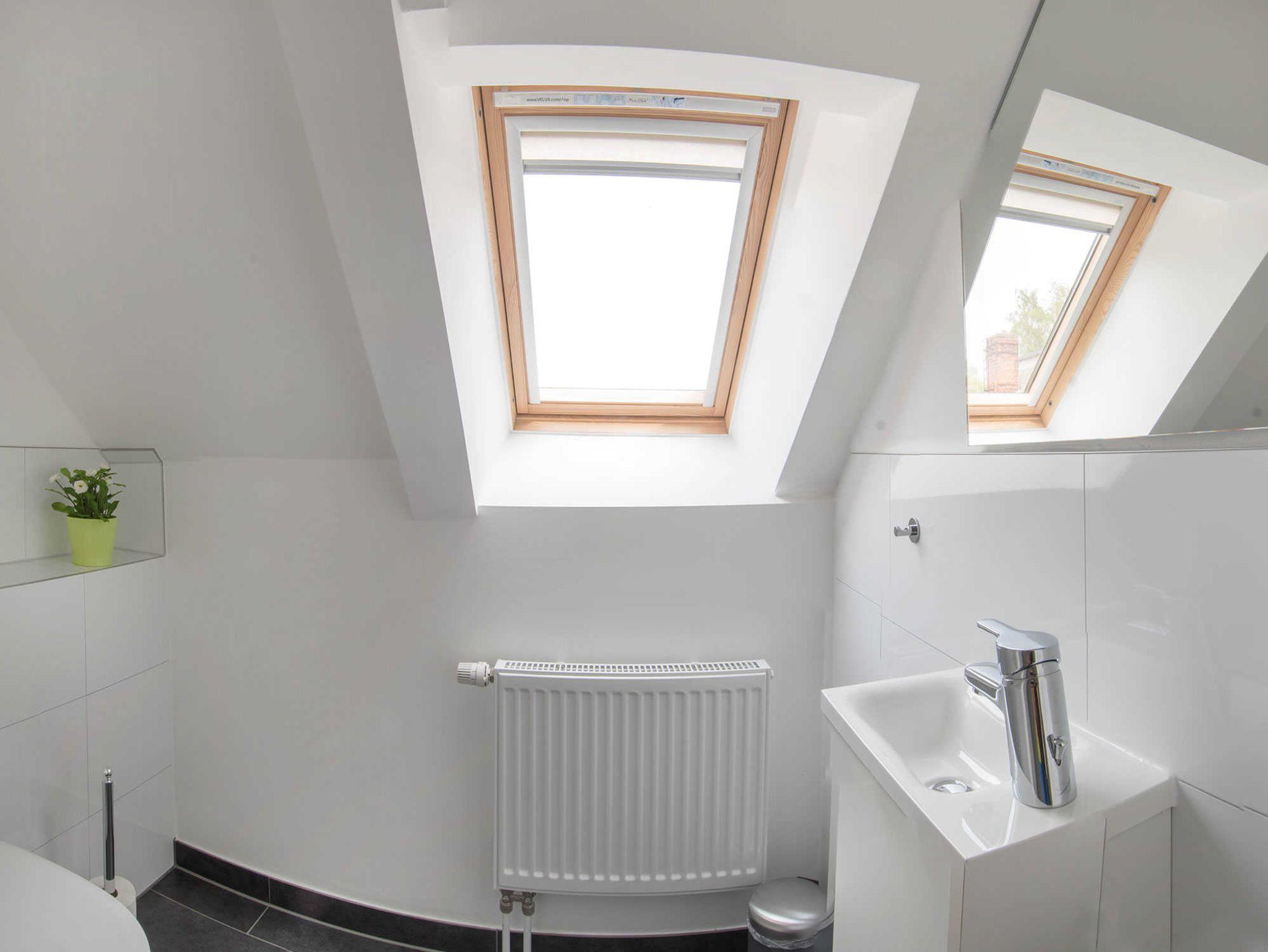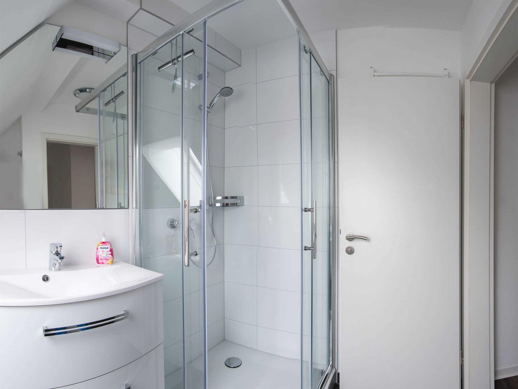 Das Duschbad ist mit einer moderne Glasdusche, WC und Waschtisch eingerichtet. Zusätzlich gibt es noch ein separates WC mit Waschtisch.