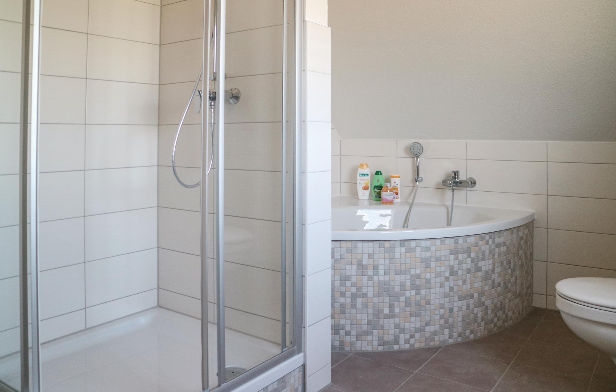 Badezimmer (nr. 1) - WC. Warmes und kaltes Wasser. Handdusche, Wanne und Dusche