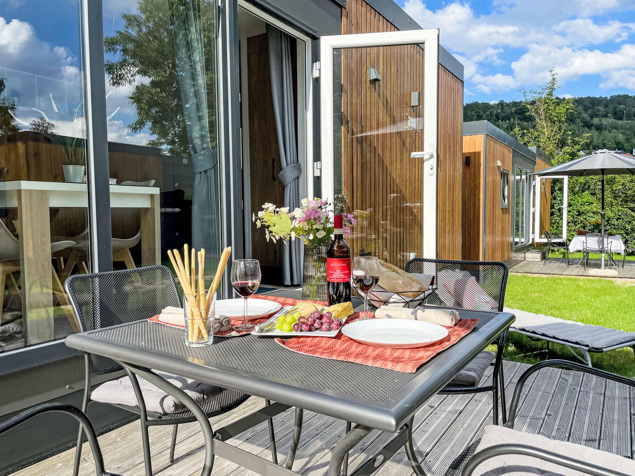 "Tiny Haus Sonnenplatz", 3-Zimmer-Mobilheim 32 m2, im Erdgeschoss. Gemütlich eingerichtet: Wohn-/Schlafzimmer mit 1 Diwanbett (120 cm, Länge 170 cm), Esstisch und Sat-TV (Flachbildschirm). Ausgang zur Terrasse. 1 Zimmer mit 1 franz. Bett (140 cm, Länge 200 cm). 1 Zimmer mit 2 Betten (80 cm, Länge 200 cm). Kochnische (4 Glaskeramikplatten, Wasserkocher, Tiefkühler, elektrische Kaffeemaschine). Dusche/WC. E-Heizung. Kleine Terrasse. Terrassenmöbel. Zur Verfügung: Haartrockner. Parkplatz (1 Auto) in 50 m. Bitte beachten: Nichtraucher-Haus. Maximal 1 Haustier/Hund erlaubt. Rauchmelder.