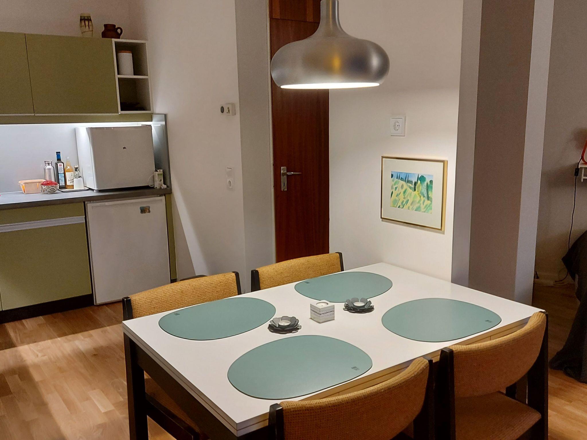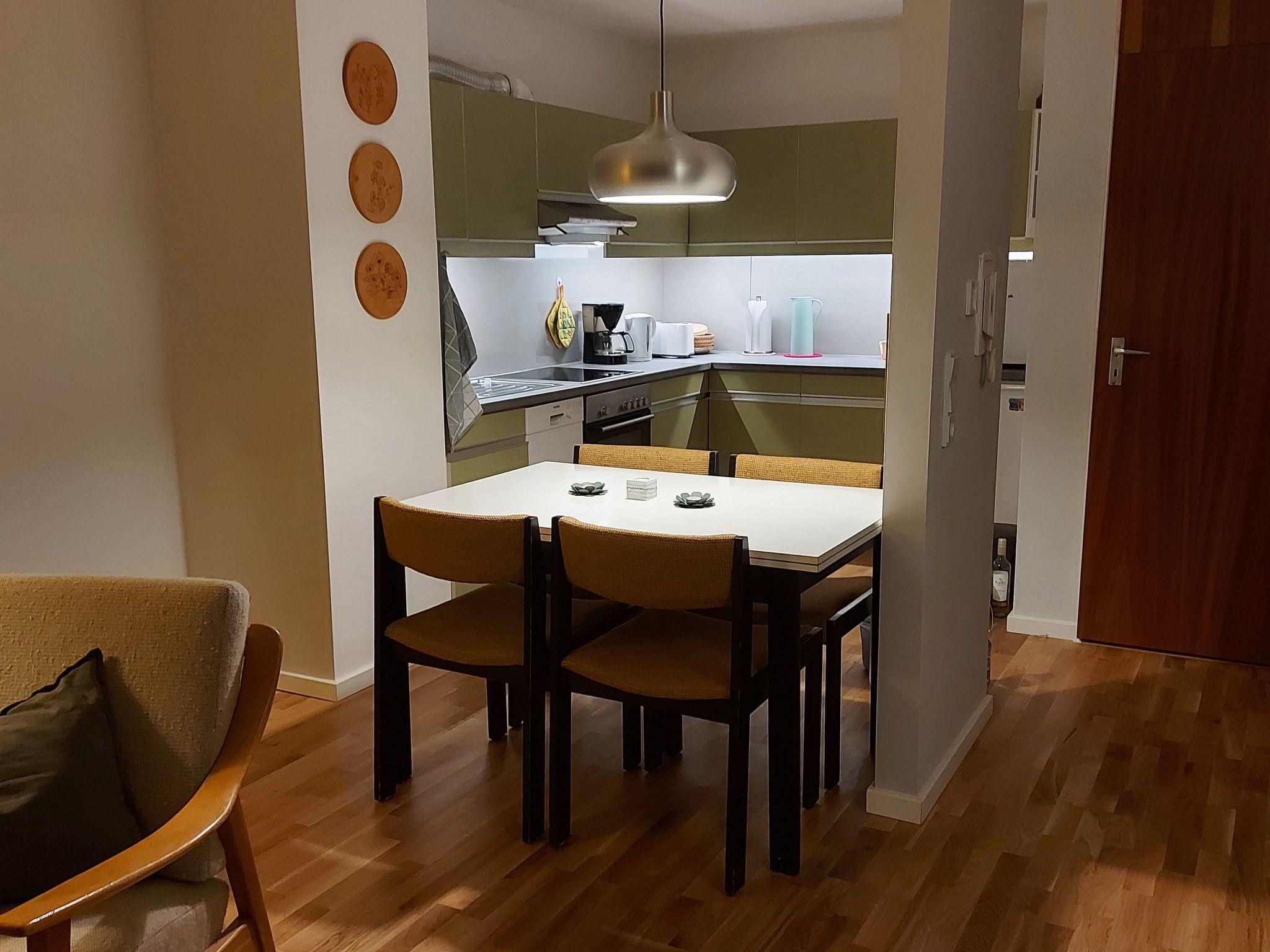 Die 65 m² große Wohnung ist für bis zu 4 Personen geeignet und hat durch ihre Lage im 4.OG einer Wohnanlage und die großen bodentiefen Fensterfronten einen wunderschönen freien Ausblick in die Natur. Mit Liebe zum Detail haben wir die Wohnung renoviert und neu gestaltet, wobei neue Elemente mit Originalen unter Berücksichtigung der Architektur aus den 70er Jahren kombiniert wurden. Das Herzstück der Wohnung bildet der offen gestaltete Wohn- und Essbereich (für 4 Personen) mit Küche. Von hier und dem überdachten möblierten Balkon aus hat man einen wunderbaren freien Blick über die Wiese zum angrenzenden Wald. Es befinden sich eine Schlafcouch, ein TV mit DVD-Player und zwei Sessel mit Couchtisch im Wohnbereich. In einer gemütlichen Zimmernische steht ein Doppelbett. Der Wohnbereich geht in den Essbereich und die Küche über. Es gibt ein separates Schlafzimmer mit Doppelbett, welches hell ist und einen eigenen überdachten Balkon hat. Das komfortable Badezimmer ist modern gestaltet und mit einer Regendusche, einem Waschbecken, WC, einer Handtuchheizung und Internet-Radio ausgestattet.