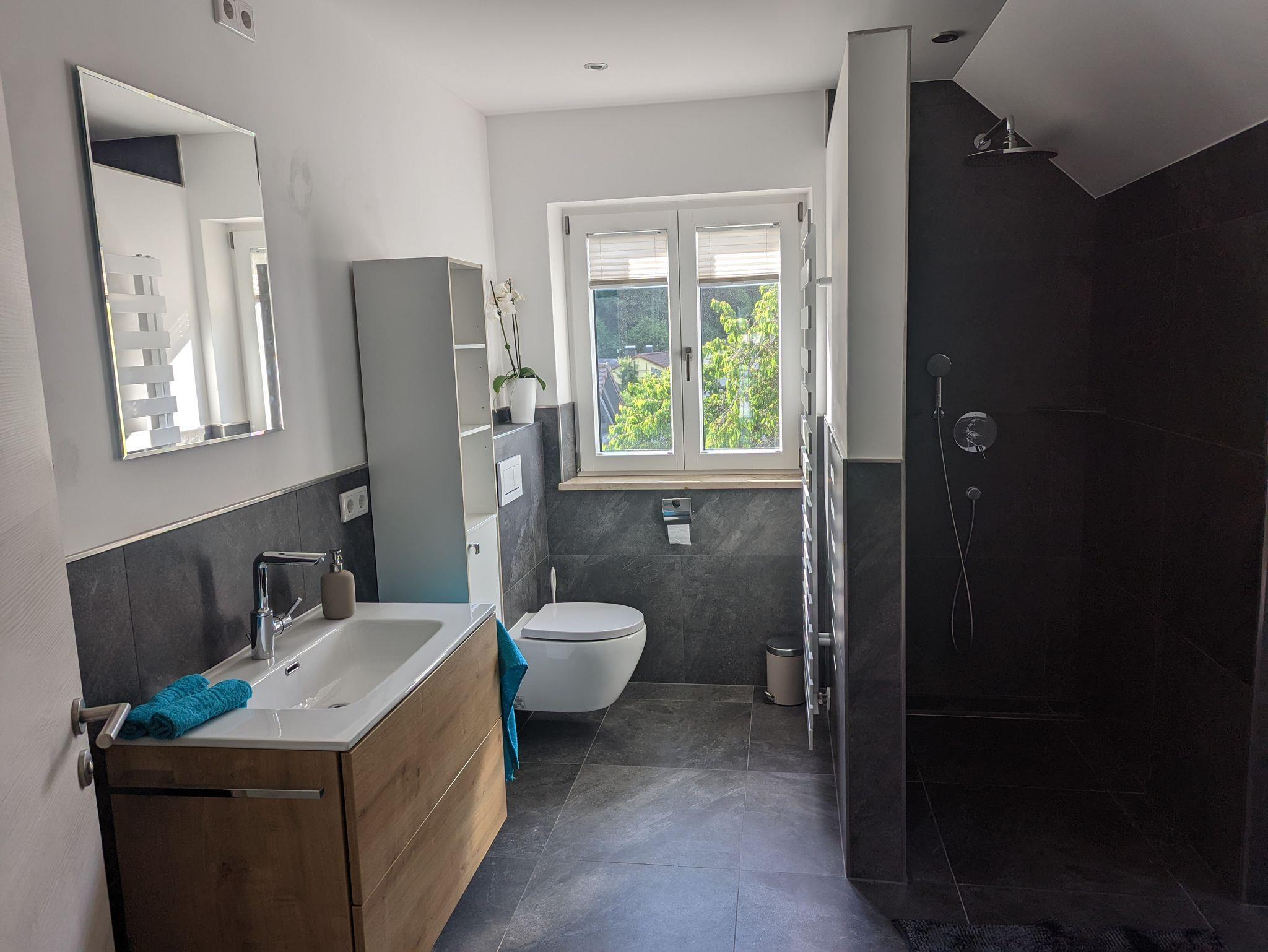 Ein Schlafzimmer mit Doppelbett sowie einem weiteren halb offenem Zimmer mit Doppelbett und einem Badezimmer mit Regendusche, WC und Badewanne sowie Waschmaschine. Der mögliche fünfte Schlafplatz ist unsere ausziehbare Schlafcouch im Wohnbereich.