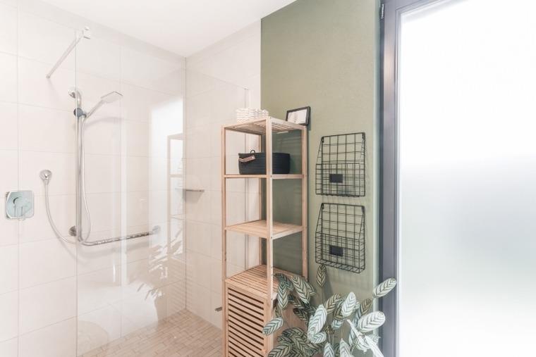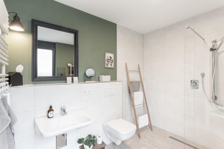 Das ansprechende Tageslichtbad verfügt über eine begehbare Dusche, WC und Waschbecken.