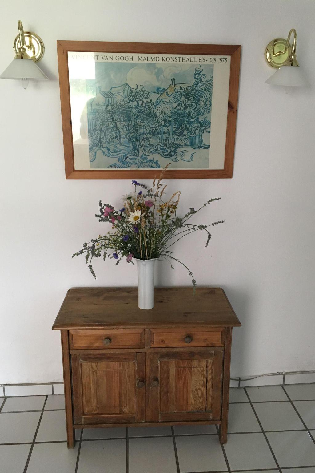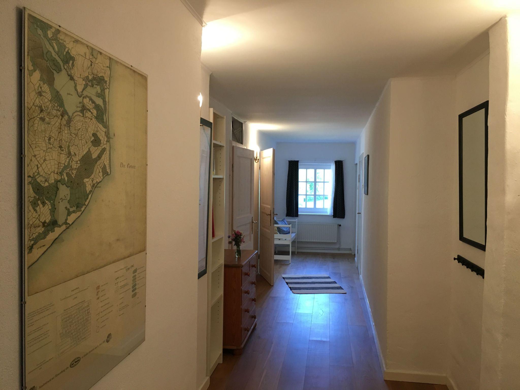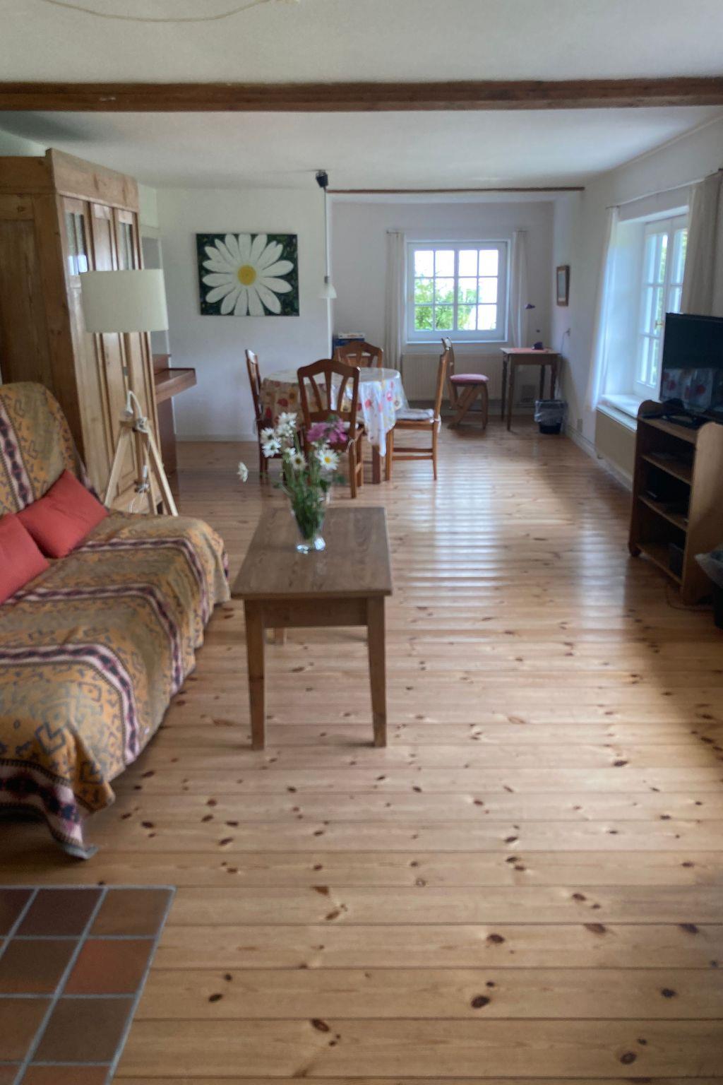 ein 34 Quadratmeter großes Wohnzimmer. Die Zimmer sind geschmackvoll, funktional und teilweise mit antiken Möbeln ausgestattet. Ein neuer edler Eichenparkettboden ergänzt die vorhandenen Kieferndielenböden. In den Schlafzimmern gibt es Doppelbetten aus Einzelbetten, in den Kinderzimmern jeweils Einzelbetten. Zwei zusätzliche Kinderbetten für Kleinkinder sind vorhanden. Das Haus eignet sich vom Grundriss auch für 2 Familien mit Kindern oder für eine Familie mit Großeltern. Das Badezimmer ist mit einer Badewanne, Waschbecken und einem WC ausgestattet, ein weiteres WC mit Waschbecken gibt es in einem separaten Raum. Außerdem ist ein neues Badezimmer mit Dusche und Waschbecken vorhanden. Internetzugang (Glasfaser) ist überall in Haus und Garten und ist kostenlos.