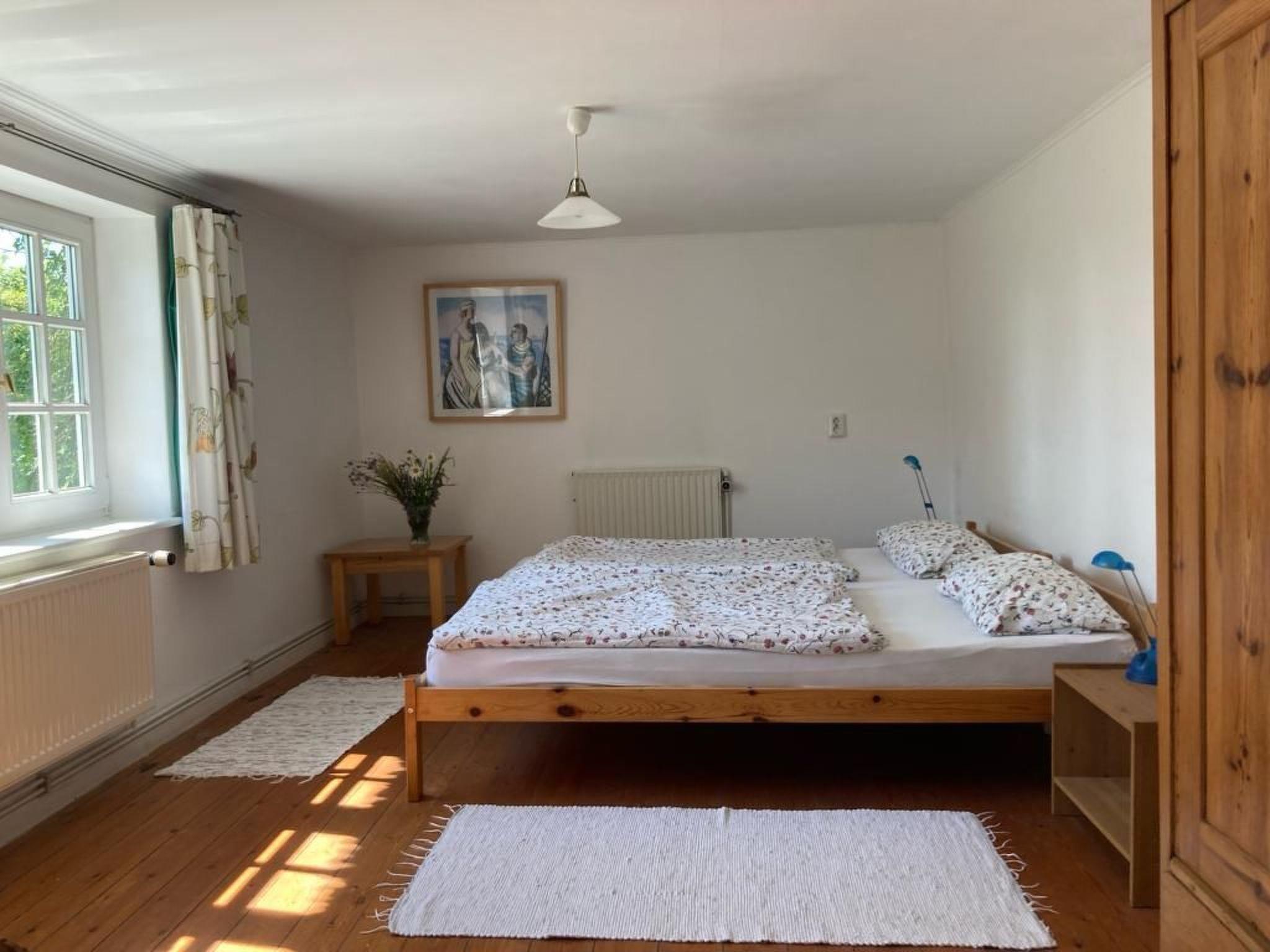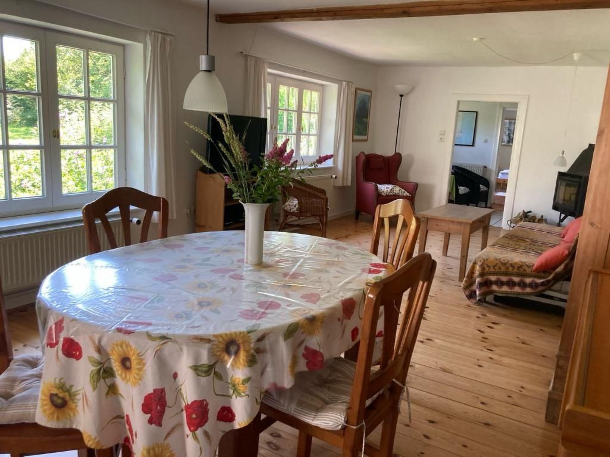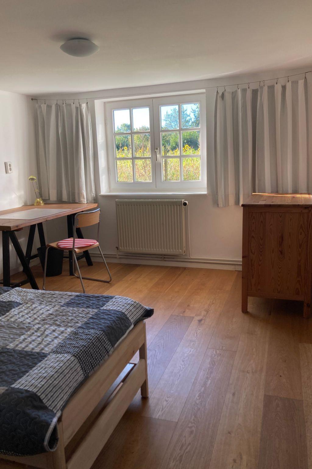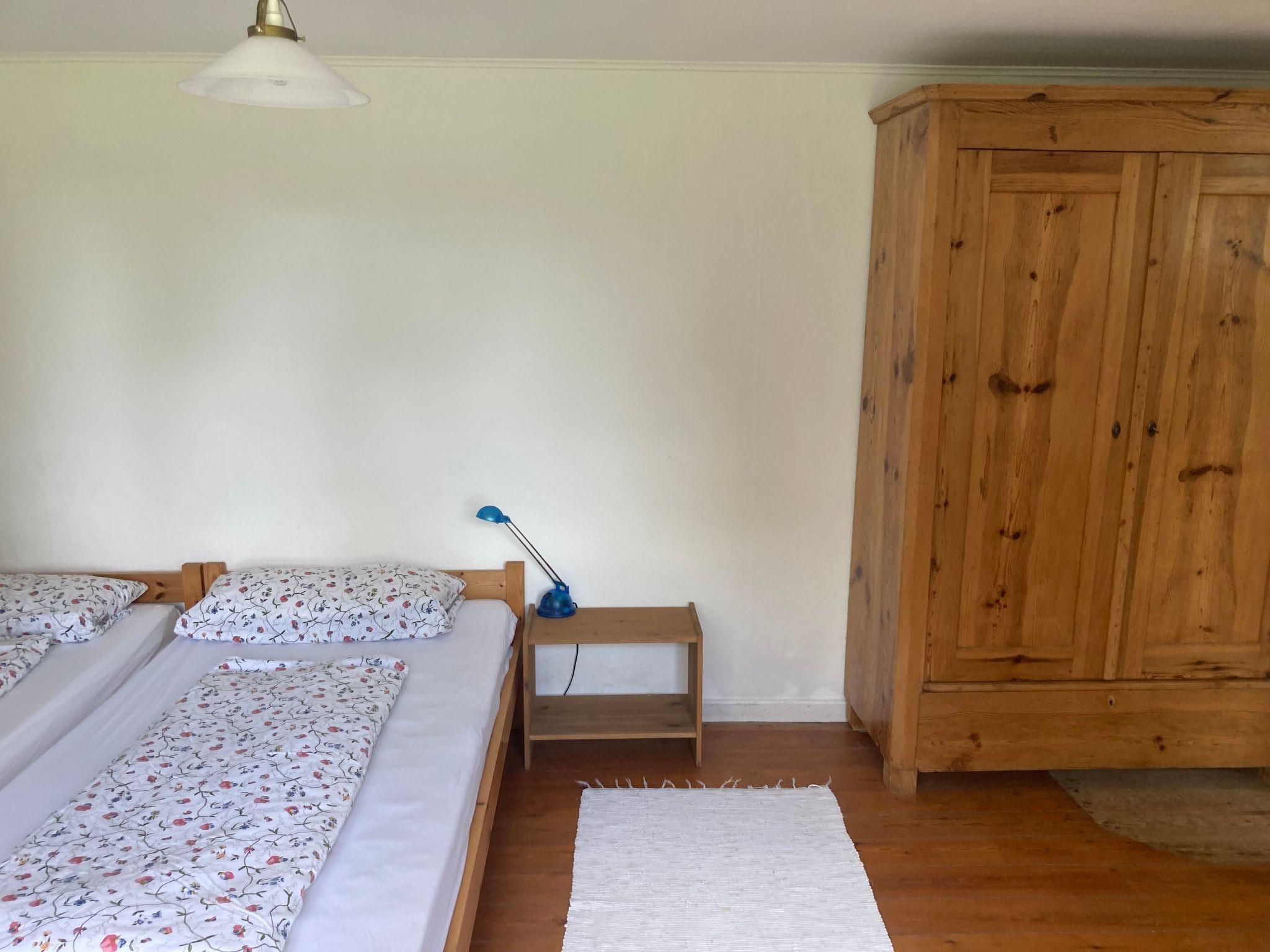 ein 34 Quadratmeter großes Wohnzimmer. Die Zimmer sind geschmackvoll, funktional und teilweise mit antiken Möbeln ausgestattet. Ein neuer edler Eichenparkettboden ergänzt die vorhandenen Kieferndielenböden. In den Schlafzimmern gibt es Doppelbetten aus Einzelbetten, in den Kinderzimmern jeweils Einzelbetten. Zwei zusätzliche Kinderbetten für Kleinkinder sind vorhanden. Das Haus eignet sich vom Grundriss auch für 2 Familien mit Kindern oder für eine Familie mit Großeltern. Das Badezimmer ist mit einer Badewanne, Waschbecken und einem WC ausgestattet, ein weiteres WC mit Waschbecken gibt es in einem separaten Raum. Außerdem ist ein neues Badezimmer mit Dusche und Waschbecken vorhanden. Internetzugang (Glasfaser) ist überall in Haus und Garten und ist kostenlos.