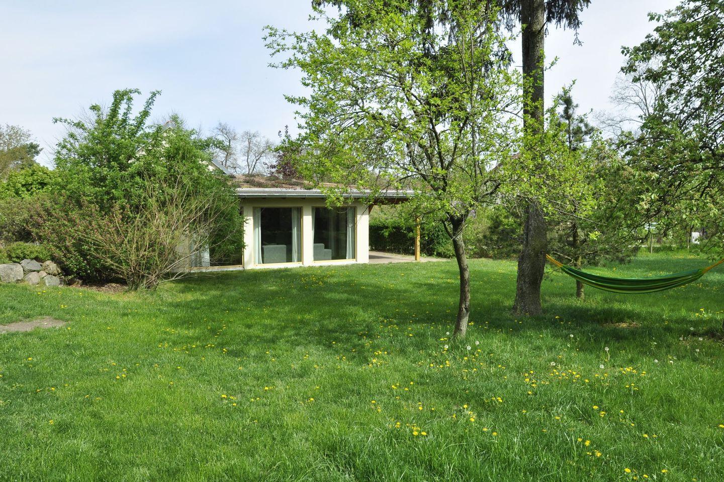 Zur Ausstattung gehören ein Schlafzimmer mit 2 Betten und eine urige Schlafgalerie mit 2 Einzelbetten (oder 1 Doppelbett), aus massivem Eichenholz aus dem benachbarten Wald gebaut. Ein großzügiger, lichtdurchfluteter Wohnbereich mit innenliegender Feldsteinmauer, holzbefeuertem Kaminofen, Smart-TV, Musikanlage, Essecke, gemütlichem Ecksofa, Bad mit bequemer, bodengleicher Dusche und WC, hochwertig ausgestattete Einbauküche mit Geschirrspüler, Herd und Backofen, Kühlschrank mit Tiefkühlfach und Waschmaschine gehören zur modernen Ausstattung. Eine überdachte Südterrasse mit Liegestühlen und Gartenmöbeln sowie ein eigener Garten laden zum Entspannen in der Natur ein.