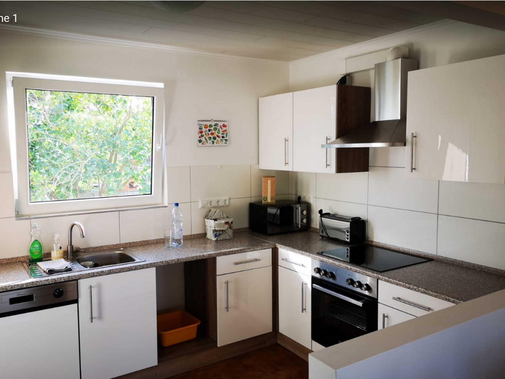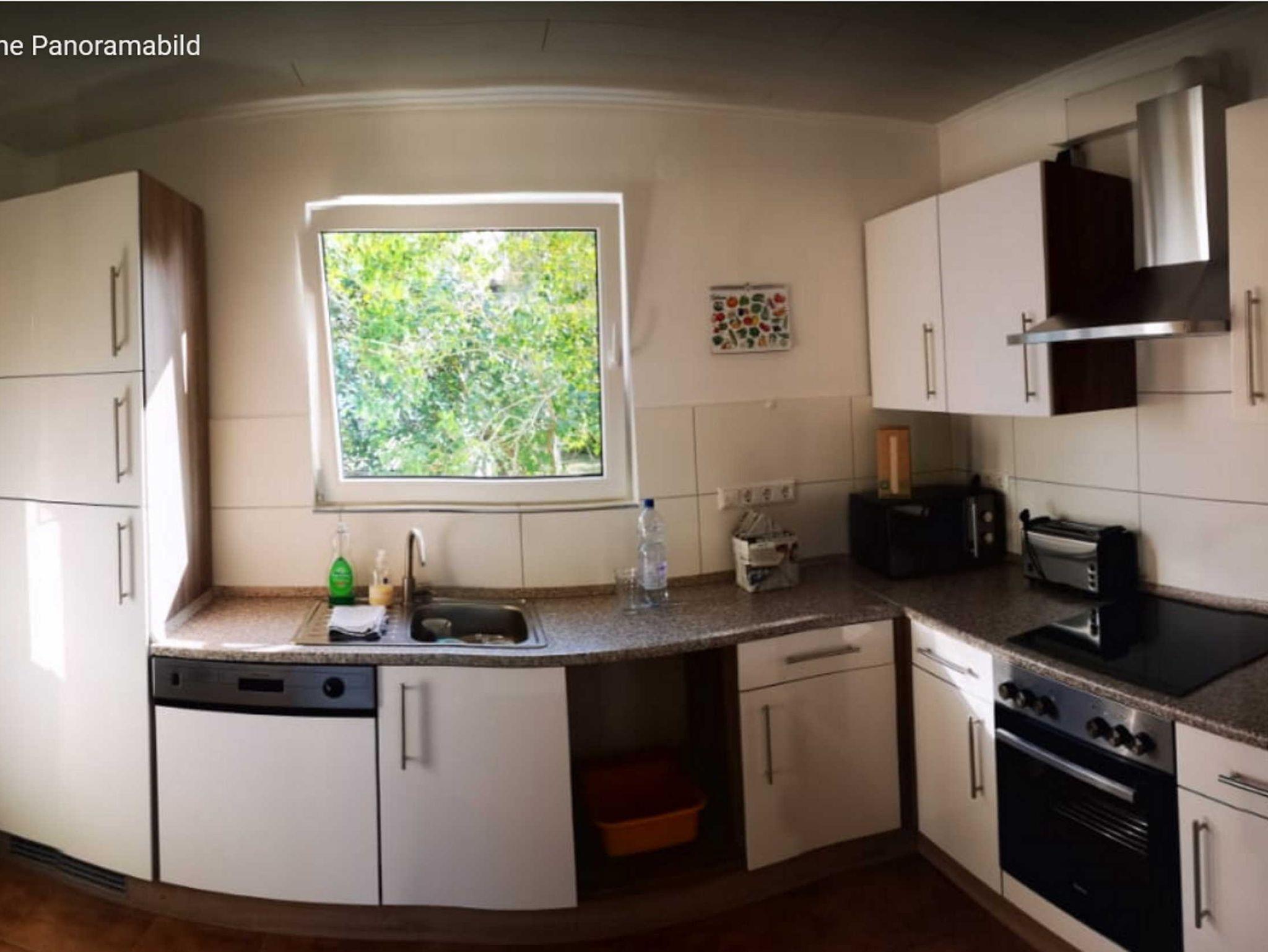 Die Küche enthält an Geräten eine Kühl-Gefrierkombination, einen Geschirrspüler, einen Glaskochfeldherd und Backofen, einen Mikrowellenherd, eine Filterkaffeemaschine, einen Toaster, einen Wasserkocher und einen Eierkocher. Geschirr, Gläser, Besteck, Schüsseln, Töpfe und Pfannen sind ebenfalls vorhanden - sowie weitere kleine Küchenhelfer (Sieb, Raspel, Brotmesser, Küchenmesser, Schere, Kochlöffel etc.).