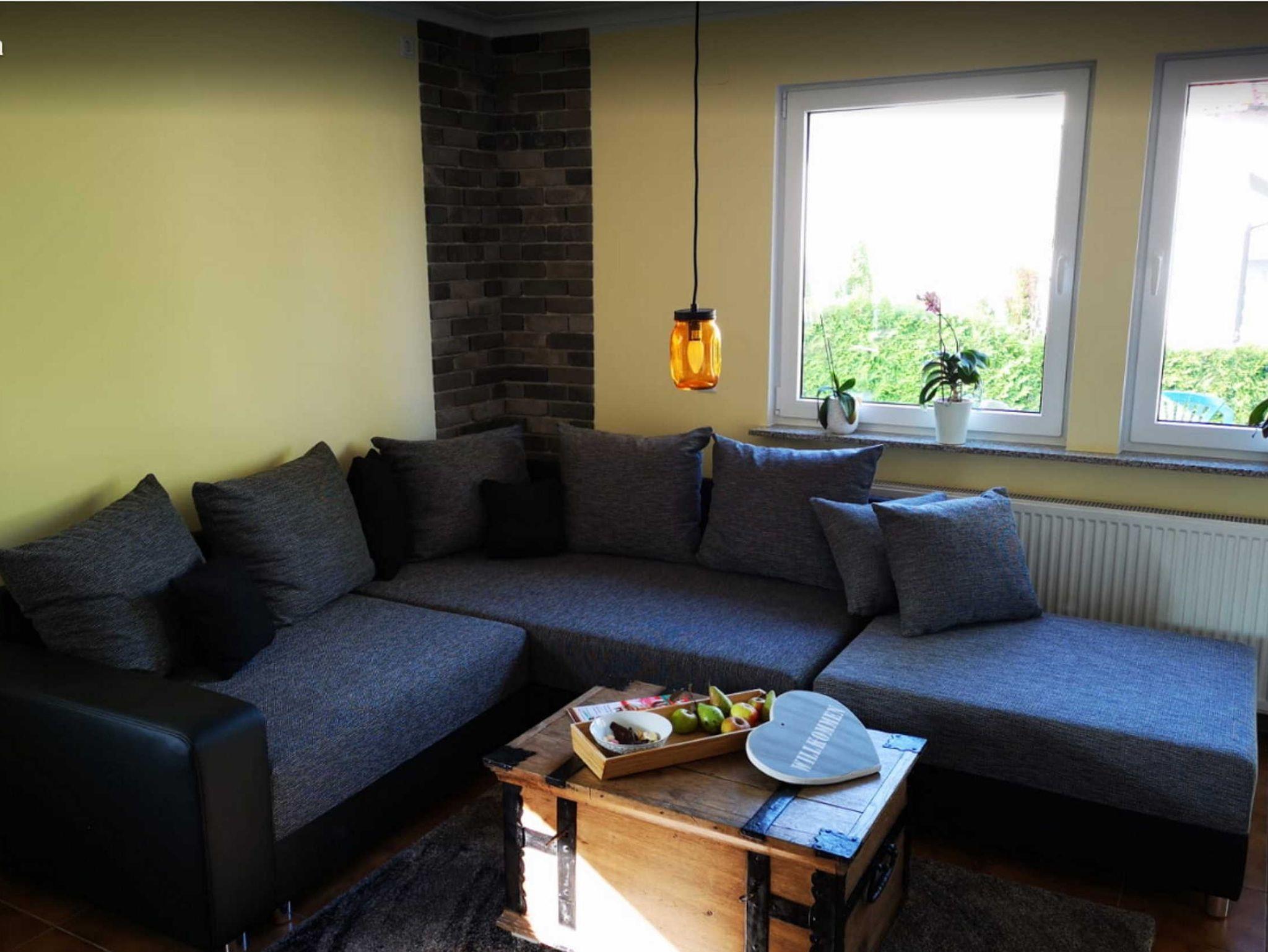 Im Wohnbereich befindet sich eine gemütliche Sitzlandschaft mit großem Hocker, Kissen und einem niedrigen Truhentisch. Gegenüber befindet sich das TV-Lowboard auf dem der Fernseher steht. Im Lowboard haben wir jede Menge Brettspiele zu Ihrer Unterhaltung verstaut. Links vom TV kuschelt sich unser kleiner Kaminofen in die Ecke. Aktuell ist er noch nicht in Betrieb, weil die Abnahme vom Schornsteinfeger noch aussteht. Aber wir wollen diesen Kamin auf jeden Fall nutzbar machen.