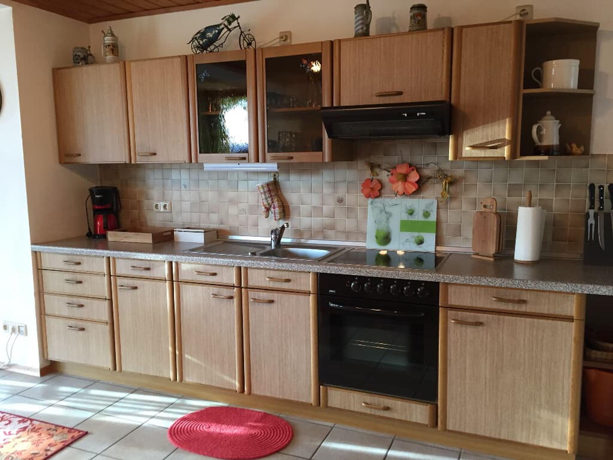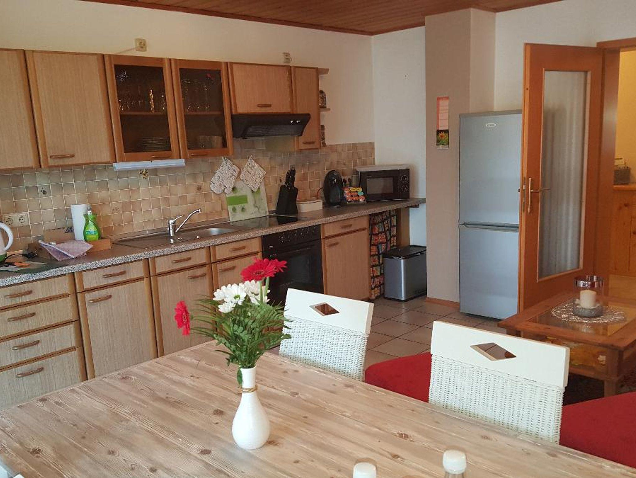 Ihnen steht eine ebenerdige, renovierte 70 qm große Ferienwohnung für bis zu 5 Personen im Erdgeschoß mit eigenem Eingang, sowie eine eigene, möbillierte und überdachte Terrasse mit Grill, Gartenliegen und privatem, kostenlosen Parkplatz zur Verfügung. Die Wohnung verfügt über ein Bad mit Dusche/WC, zwei Schlafzimmern mit je einem Doppelbett (180*200), ein weiteres Zustellbett ist möglich. In dem kombinierten Wohn/Essbereich finden Sie einen FlachTV, DVD Player und Radio. In der vollausgestatteten Küche befindet sich ein Kühlschrank mit 3 Gefrierfächern, Herd mit Backofen, eine Mikrowelle, Kaffeemaschine,Toaster, Eierkocher und Mixer. In der Gästeecke finden Sie Wanderkarten, Gesellschaftsspiele und Infomaterial. Im Preis inkl.: Handtücher und Bettwäsche, Babybett/Hochstuhl, Endreinigung, sowie eine Hygieneerstausstattung für Küche/Bad für die ersten Tage und eine Flasche Wasser. Haustiere gegen einmalige Gebühr in Höhe von 20,00 Euro.