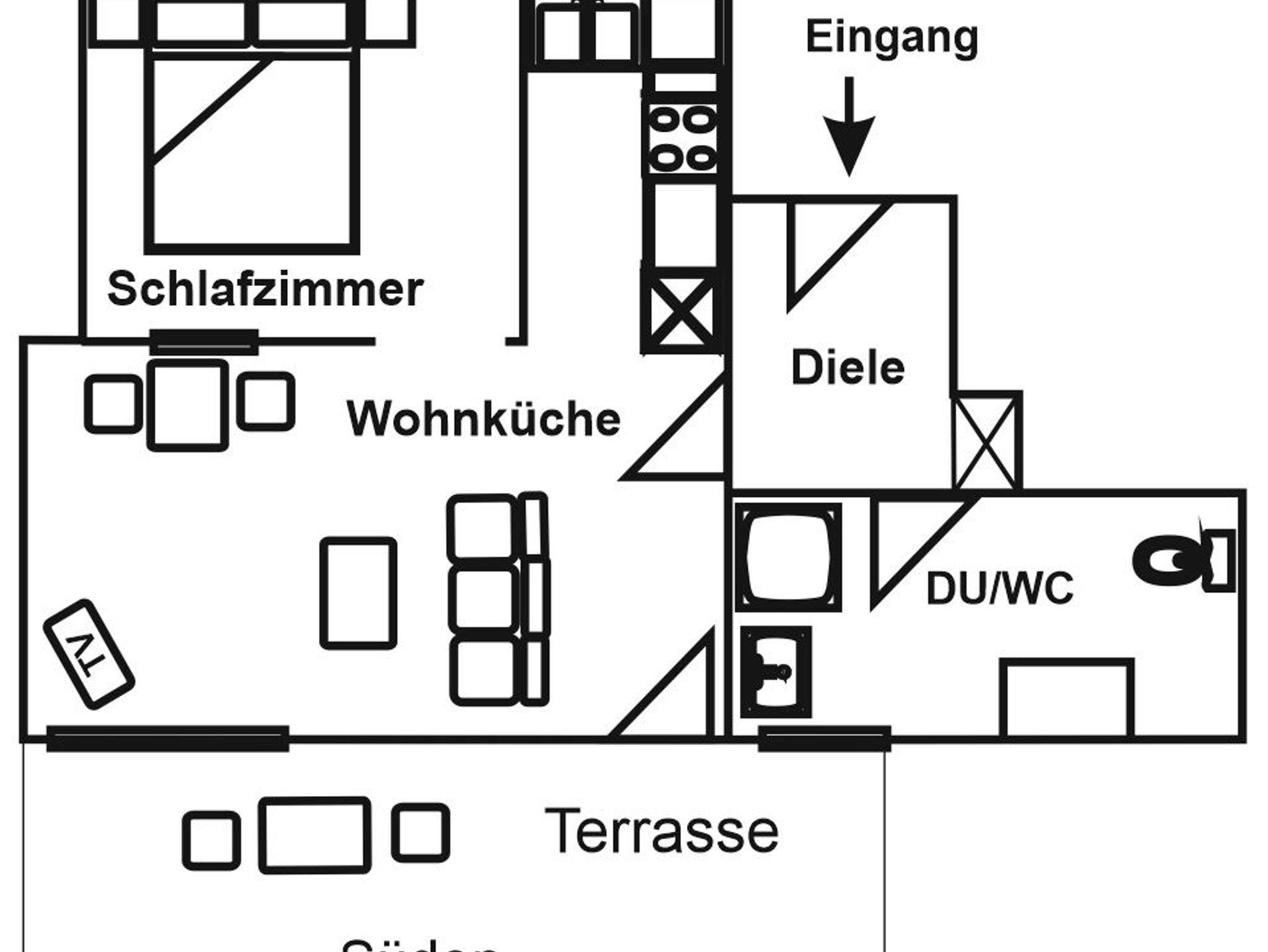 Helle und freundlich eingerichtete Ferienwohnung, Küche mit kompletter EBK, Spülmaschine, 1 Schlafzimmer, Brötchendienst, SAT-TV.