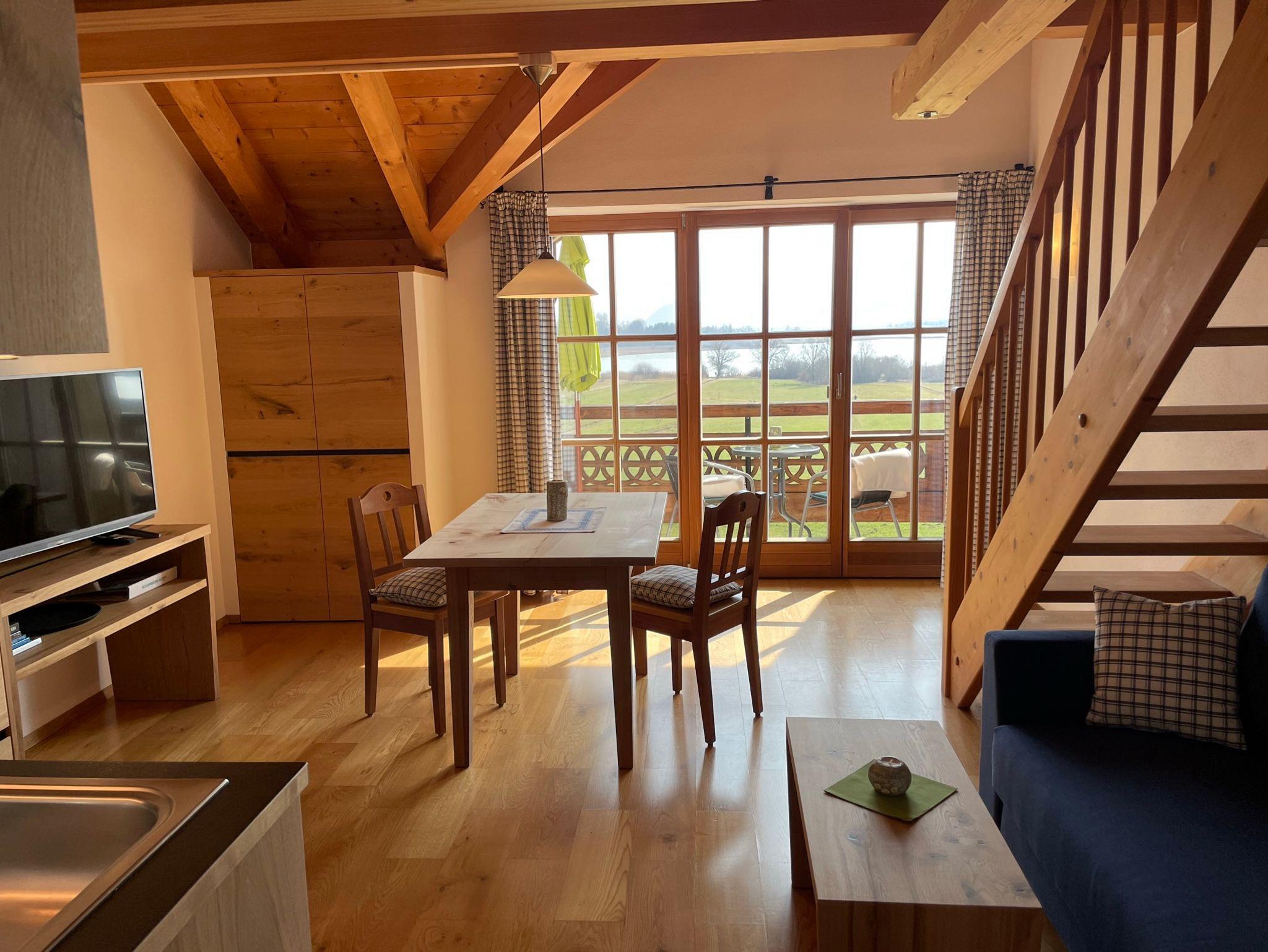 Die etwa 40 qm große Ferienwohnung ist durch eine Schlafgalerie räumlich getrennt und befindet sich im 2. Stock des See Cafe Toni, ein einzelstehendes Landhaus am Nordufer des Chiemsees mit Blick über die Schafwaschener Bucht und die Chiemgauer Alpenkette.
