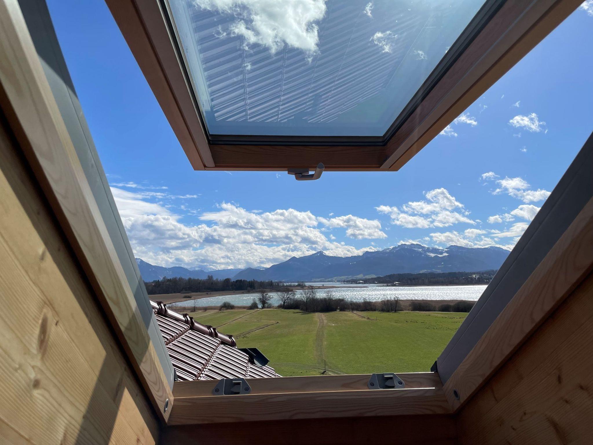 Die etwa 36 qm große Ferienwohnung ist durch eine Schlafgalerie räumlich getrennt und befindet sich im 2. Stock des See Cafe Toni, ein einzelstehendes Landhaus am Nordufer des Chiemsees mit Blick über die Schafwaschener Bucht und die Chiemgauer Alpenkette.