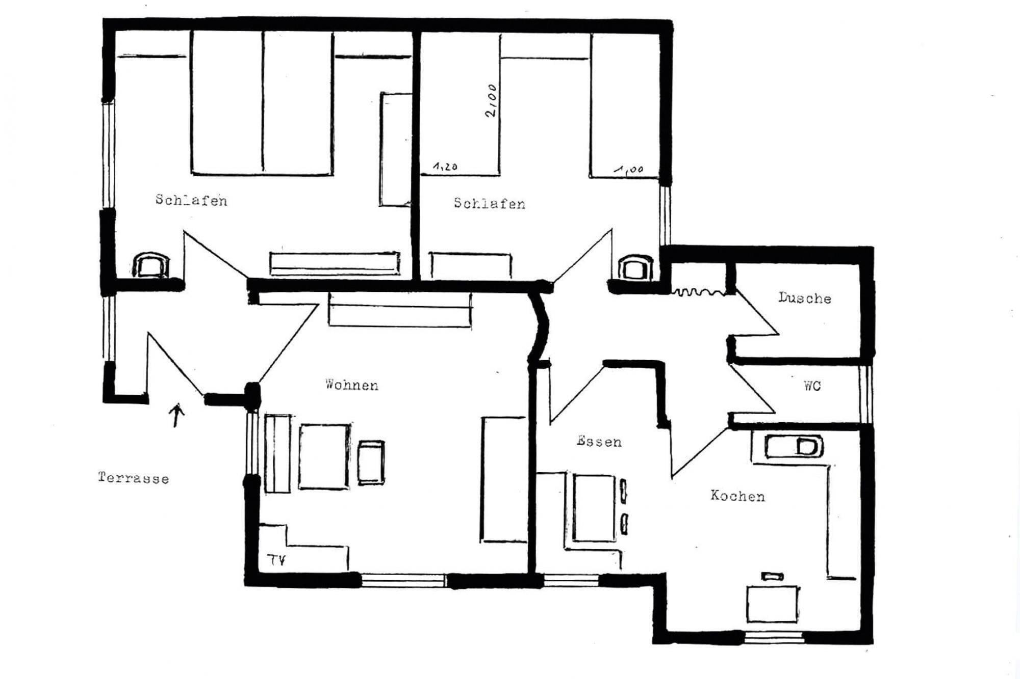 Wohnzimmer(TV(Satellit), Heizung(Gas)), Küche(Herd, Wasserkocher, Toaster, Kaffeemaschine, Backofen, Mikrowelle, Kühlschrank), Schlafzimmer(Doppelbett), Schlafzimmer(2x Einzelbett), Badezimmer(Dusche), Toilette, Grill, Terrasse, Gartenmöbel, Parkplatz