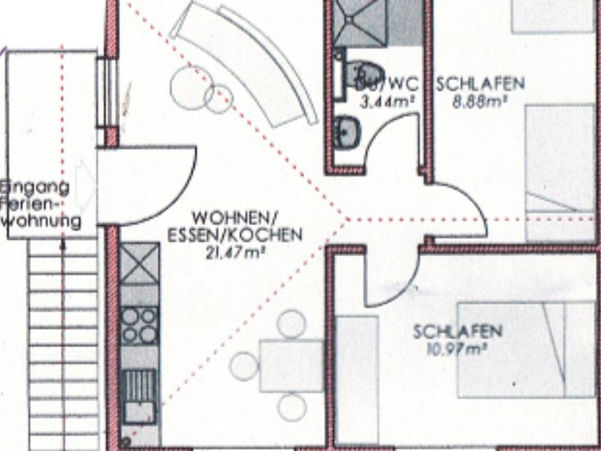 Neue Ferienwohnung (45 m²) mit komplett eingerichteter Küchenzeile mit Backofen, Ceranfeld, Mikrowelle, Geschirrspüler, Kühlschrank mit Gefrierfach, Sitzecke mit SAT-TV, DVD-Recorder und Radio/CD, 1 Doppelschlafzimmer, 1 Schlafzimmer mit Einzelbett (Bett auf Doppelbett ausziehbar für bis zu 2 Personen), Bad mit Dusche/WC.