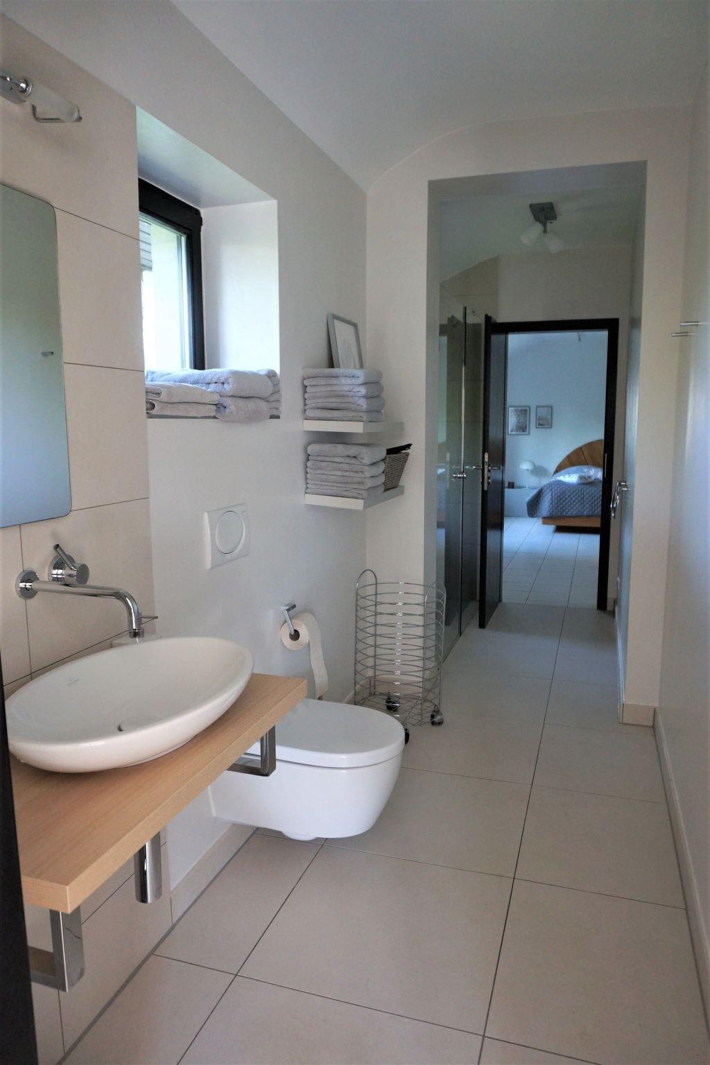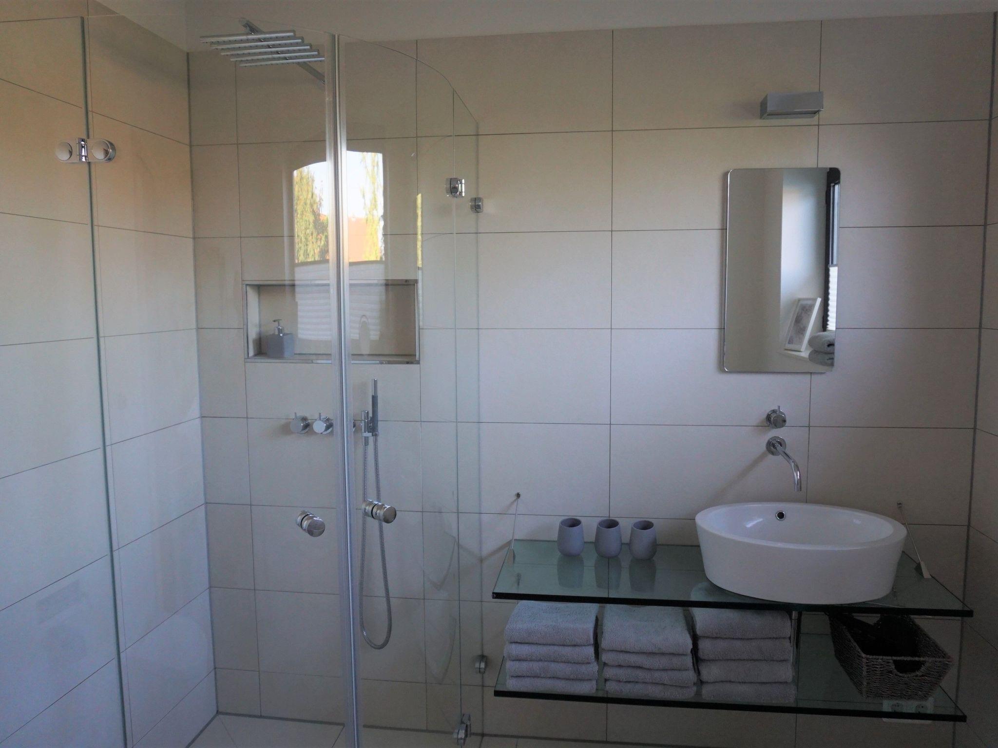 Daran angrenzend befindet sich ein Bad mit ebenerdiger Regendusche und einem Schlafzimmer im Landhausstil.