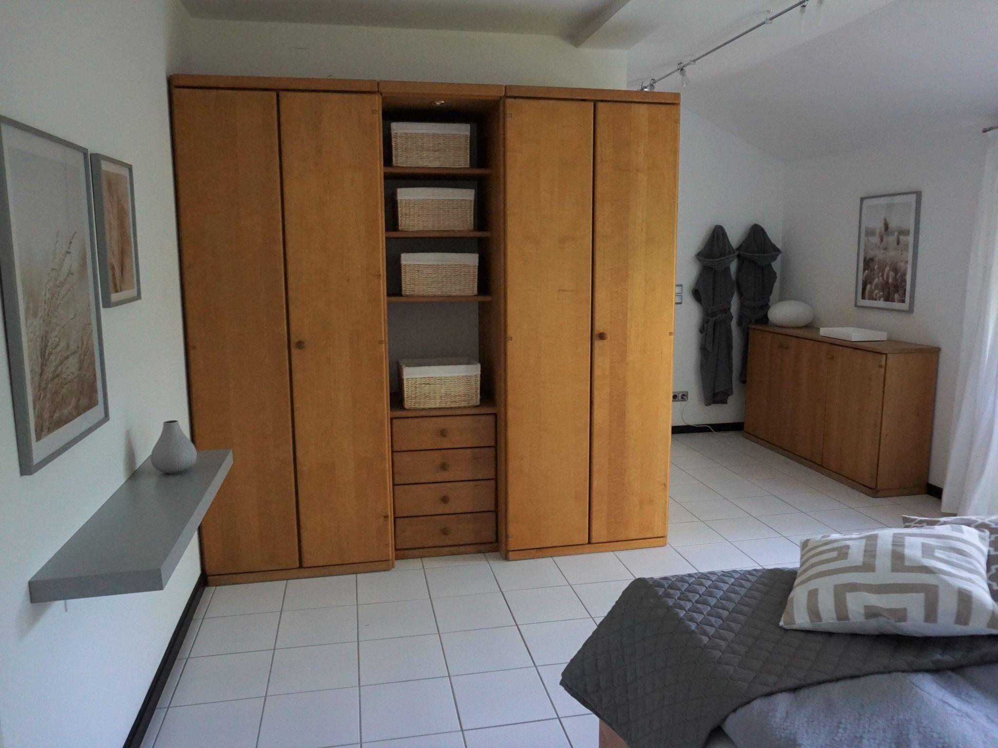 Von diesem offenen Bereich gehen ebenfalls zwei Schlafzimmer ab. Vom ersten, mit Fernseher und Echtholzmöbeln im Landhausstil ausgestattetem Schlafzimmer, erreicht man das Bad mit freistehender Badewanne und begehbarer Regendusche.