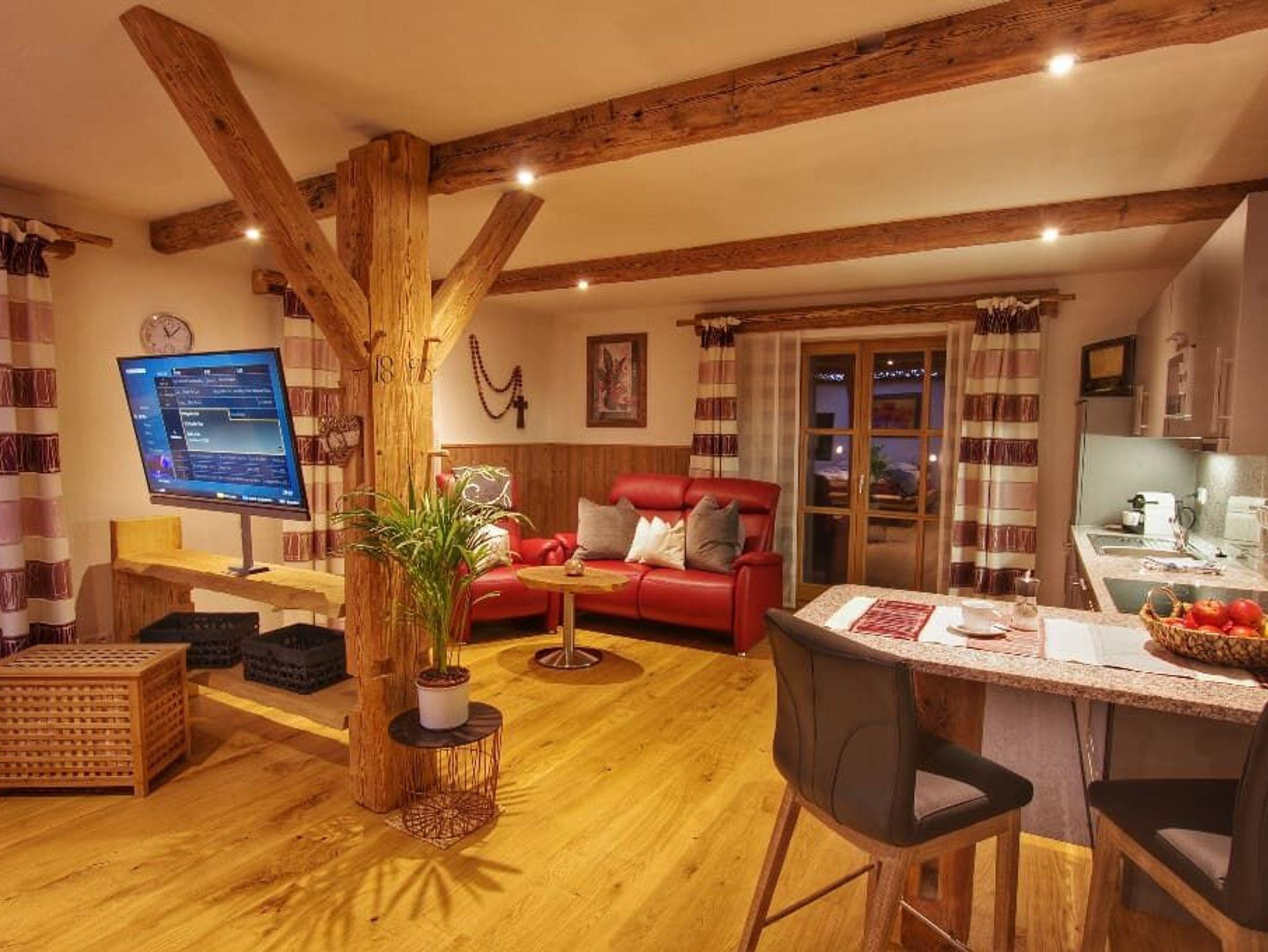 Die Ferienwohnung Holzwurzel im Erdgeschoss für 4 Personen, verfügt über eine hochwertige Ausstattung verknüpft mit bodenständigem und modernem. Großzügige komplett eingerichtete Wohnküche, 2 Schlafräume (2 Doppelbetten eins auf der Galerie), Bad mit Whirlpoolbadewanne, Dusche, 2 getrennten WC´s, und einem großzügigen Balkon. Die Wohnung hat ca. 120 m². Sat-TV in jedem Zimmer, sowie W-Lan im ganzen Haus.