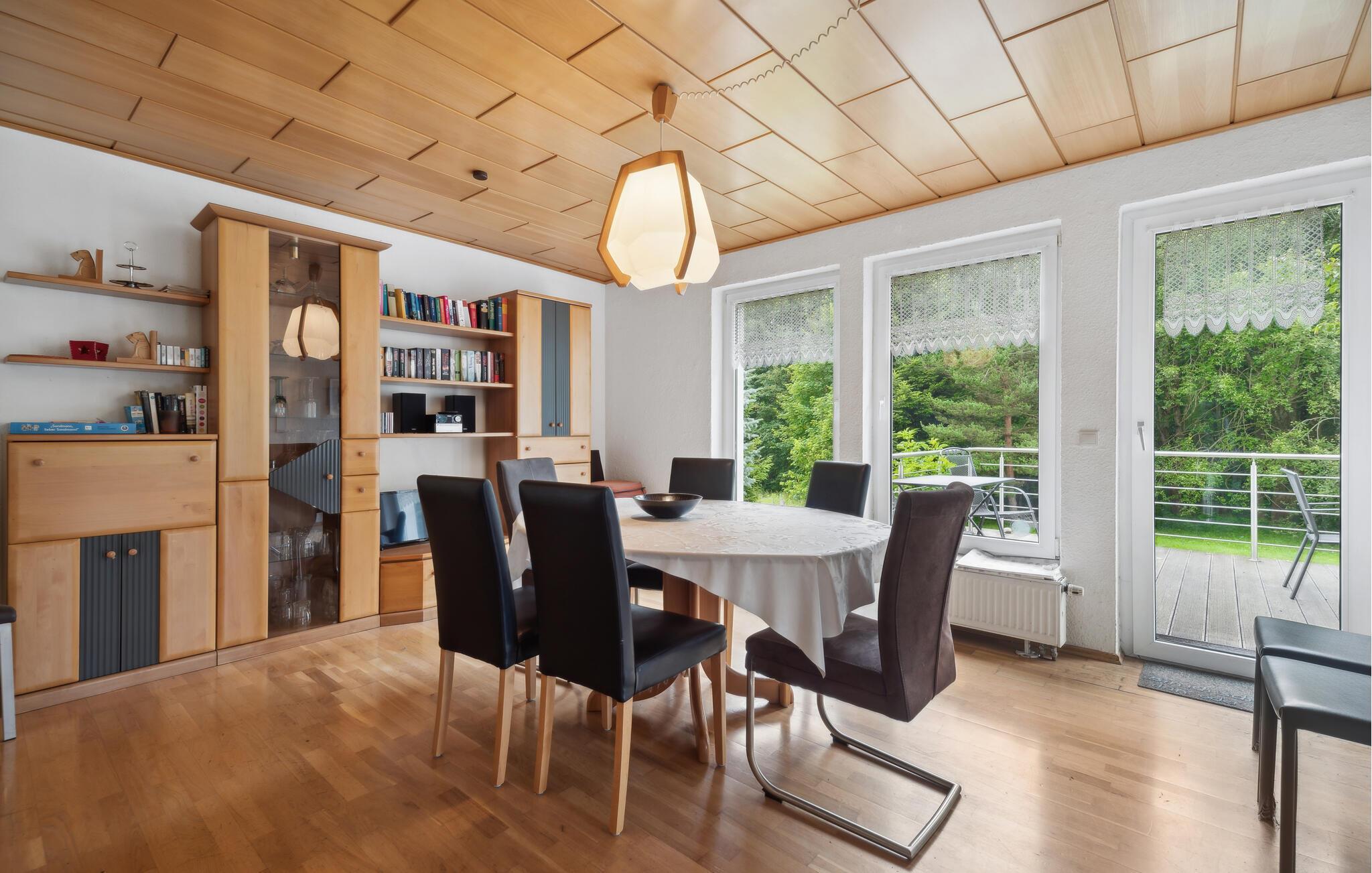 Im südlichsten Zipfel Sachsens - in Bad Brambach - bieten wir Ihnen dieses komfortable und sehr wohnliche Ferienhaus an. Alles ist sehr geschmackvoll und wohnlich möbliert. Hier können Sie in ländlicher, waldreicher Umgebung Ruhe und Erholung finden. Die Grenze nach Tschechien ist nicht weit entfernt. Rad- bzw. Wanderwege der Umgebung sind gut markiert. Die Sauna (im Keller) und ein Whirlpool für 2 Personen laden zur Entspannung ein. Für drei Schlafzimmer im Dachgeschoss gibt es ein extra Bad. Die Zimmer im Obergeschoss haben Schrägen. Ein zweiter Wohnraum (S5), mit einer Doppelcouch, TV, Bad, eine zweite Küche und Fußbodenheizung befinden sich im Souterrain mit separatem Eingang von außen.