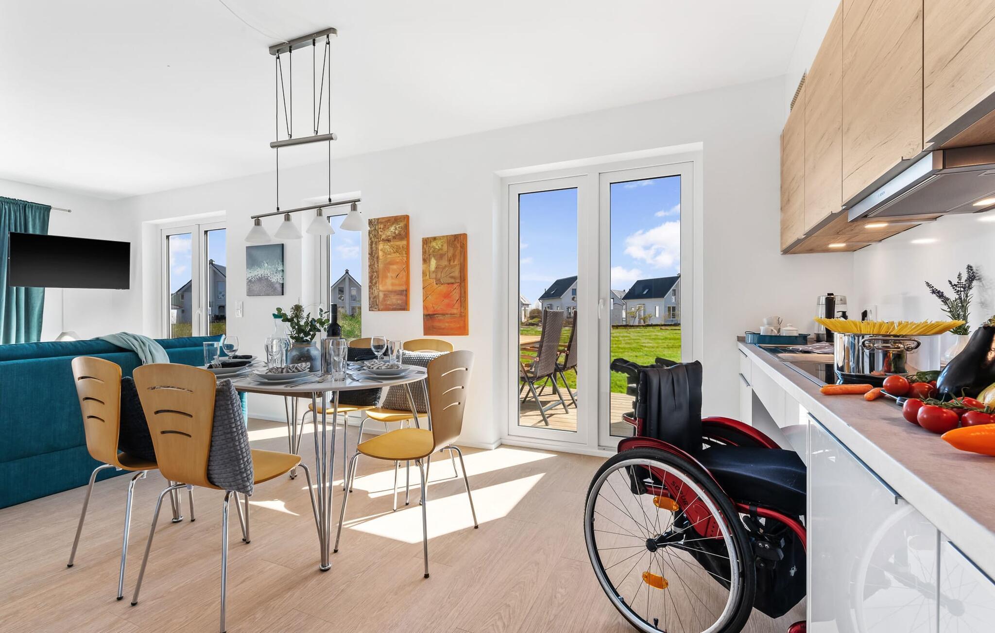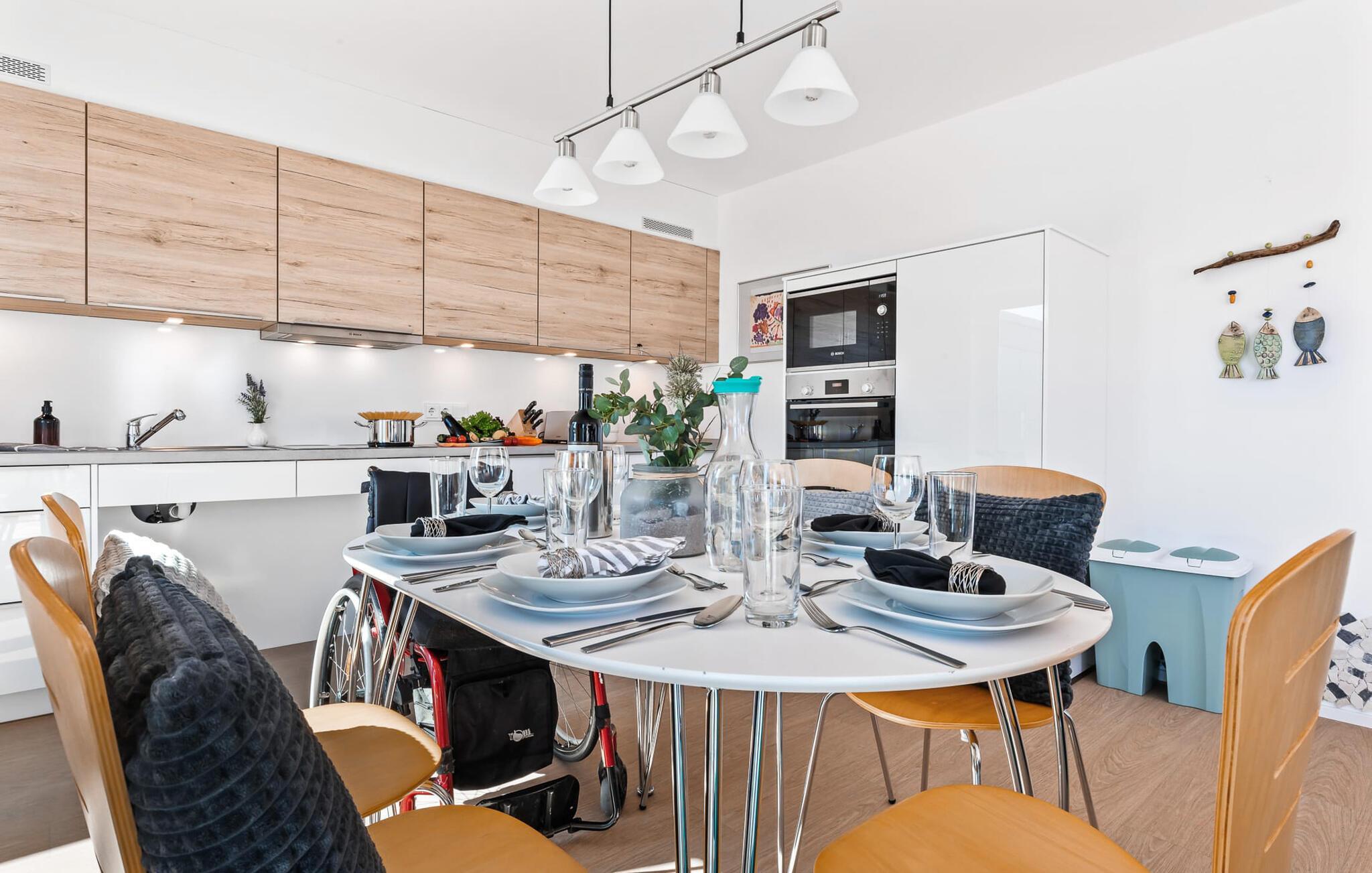 In der rundum ausgestatteten Küche sind Spüle und Kochfläche unterfahrbar. Die Abzugshaube ist im Sitzen erreichbar und der Backofen verfügt über Teleskopschienen und ist höher gesetzt. Der Essbereich bietet mit unterfahrbaren Esstisch Platz für bis zu 6 Personen.